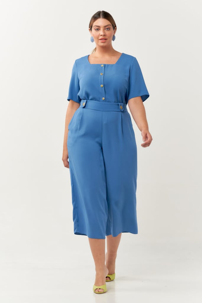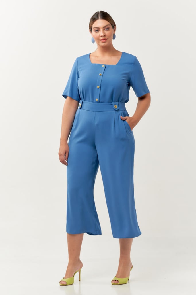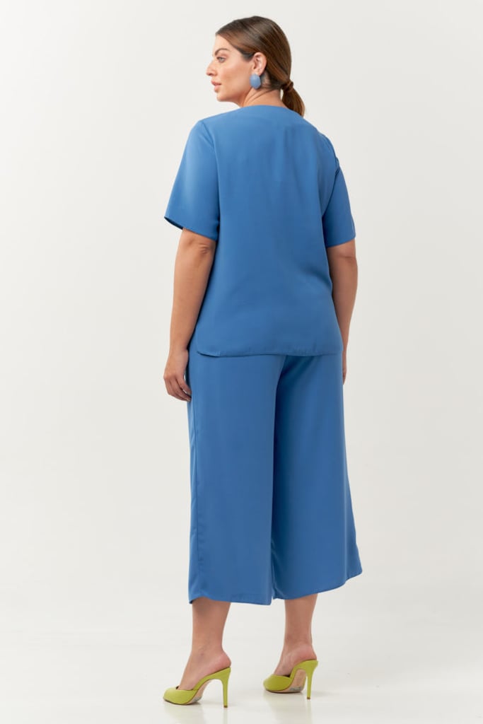 Conjunto confeccionado em tecido de crepe. Blusa possui decote quadrado, vista falsa com botões decorativos e manga curta. Pantacourt com pregas, bolsos laterais, detalhe de botões frontais e cós com elástico nas costas para maior conforto.