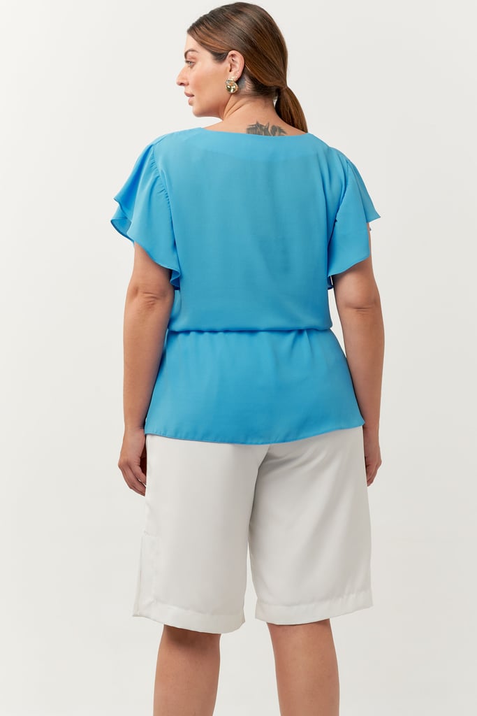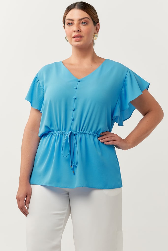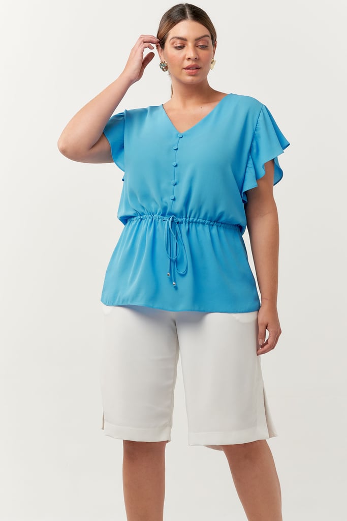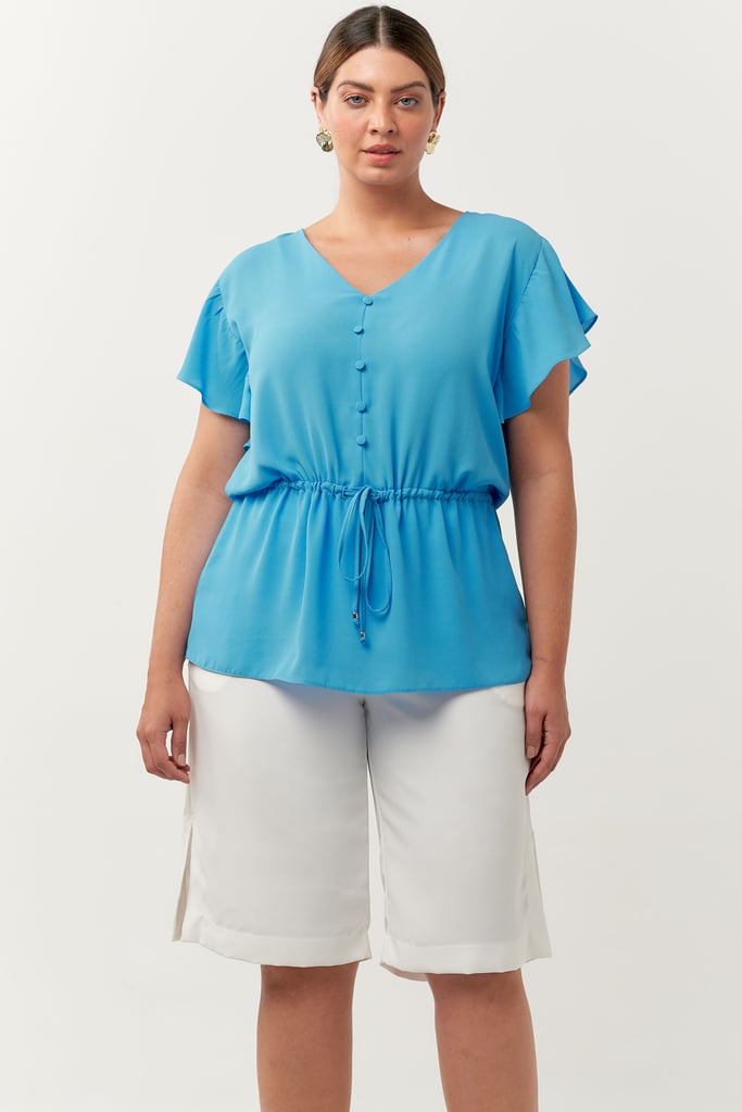 A blusa, confeccionada em tecido de crepe liso, possui decote V, manga godê, tunel e tira para amarração na cintura. Detalhe de botões decorativos.