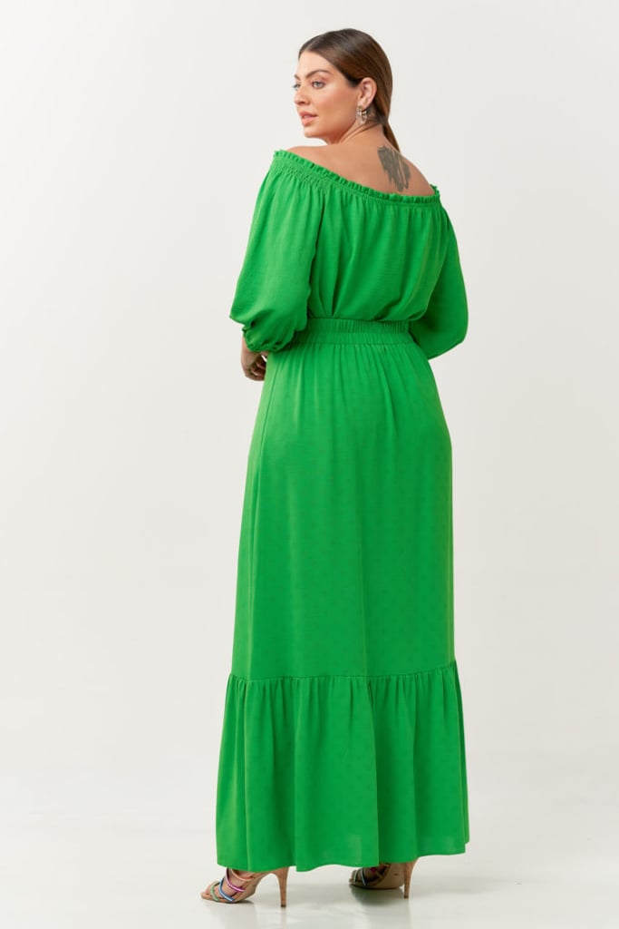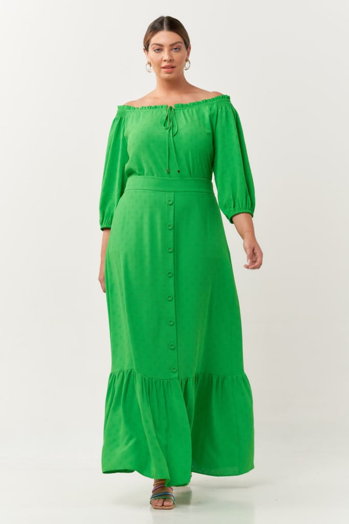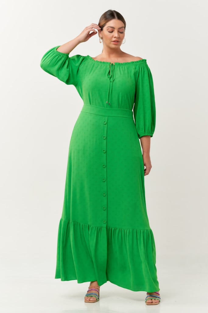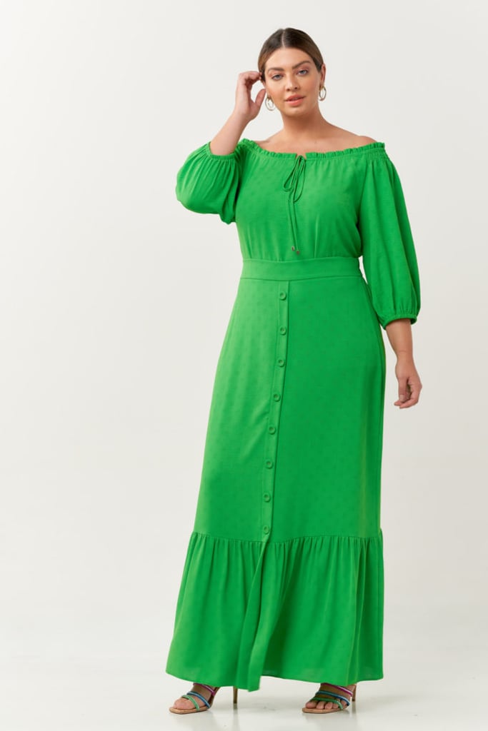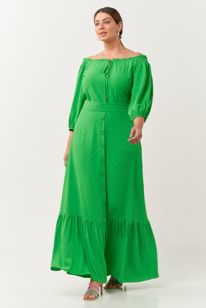 Conjunto confeccionado em tecido de crepe maquinetado. Blusa possui decote versátil com babado, tiras para amarração, detalhe de lastex no ombro e manga 3/4 com elástico. Saia com vista falsa com botões decorativos, babado na barra e cós com elástico nas costas para maior conforto.