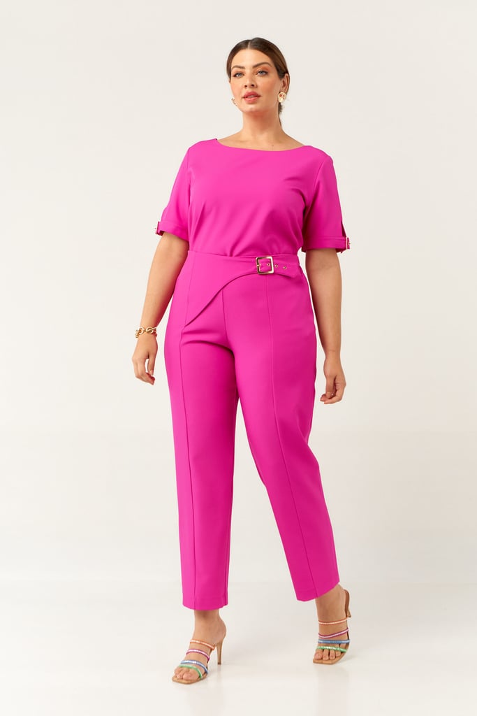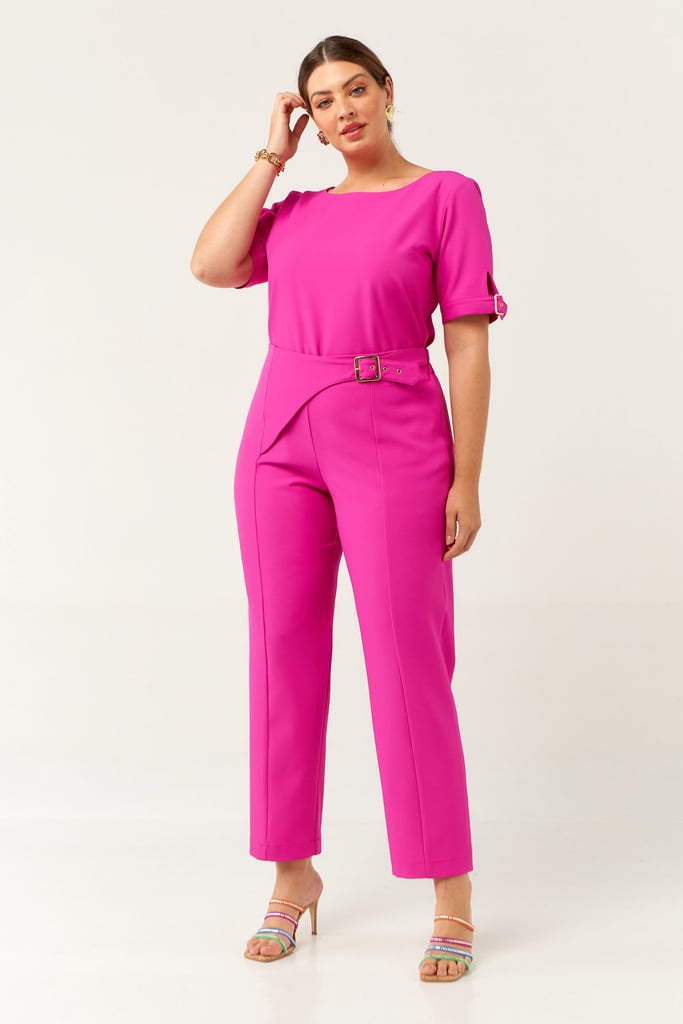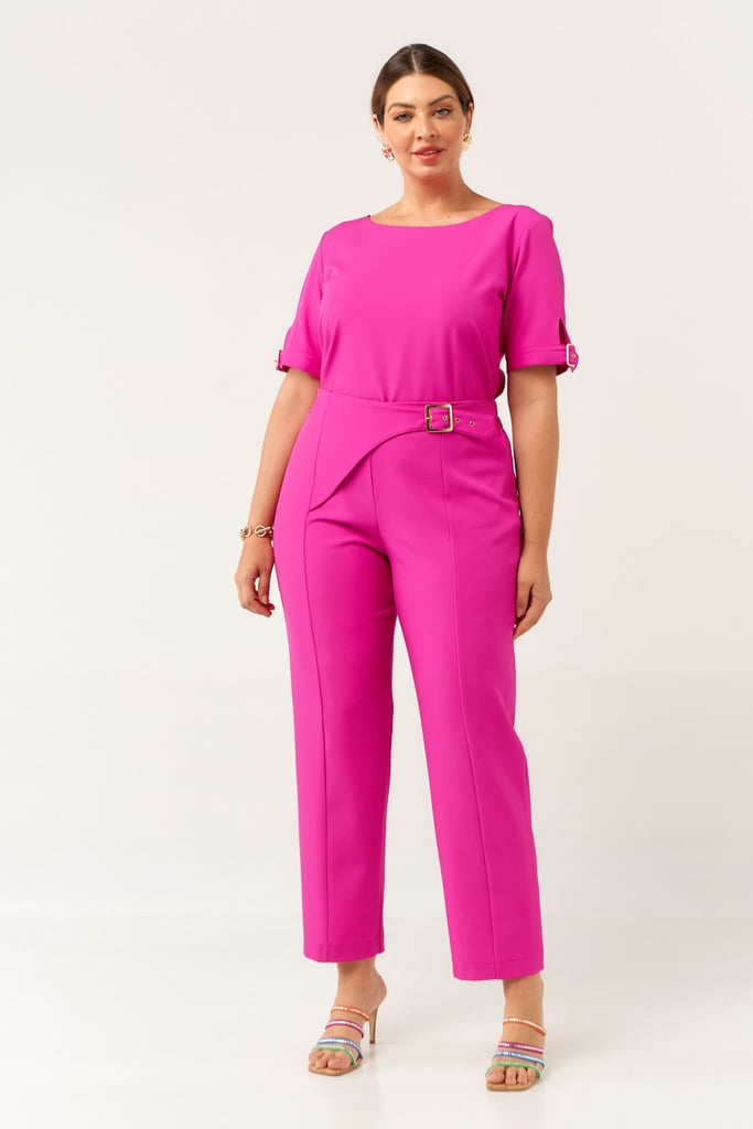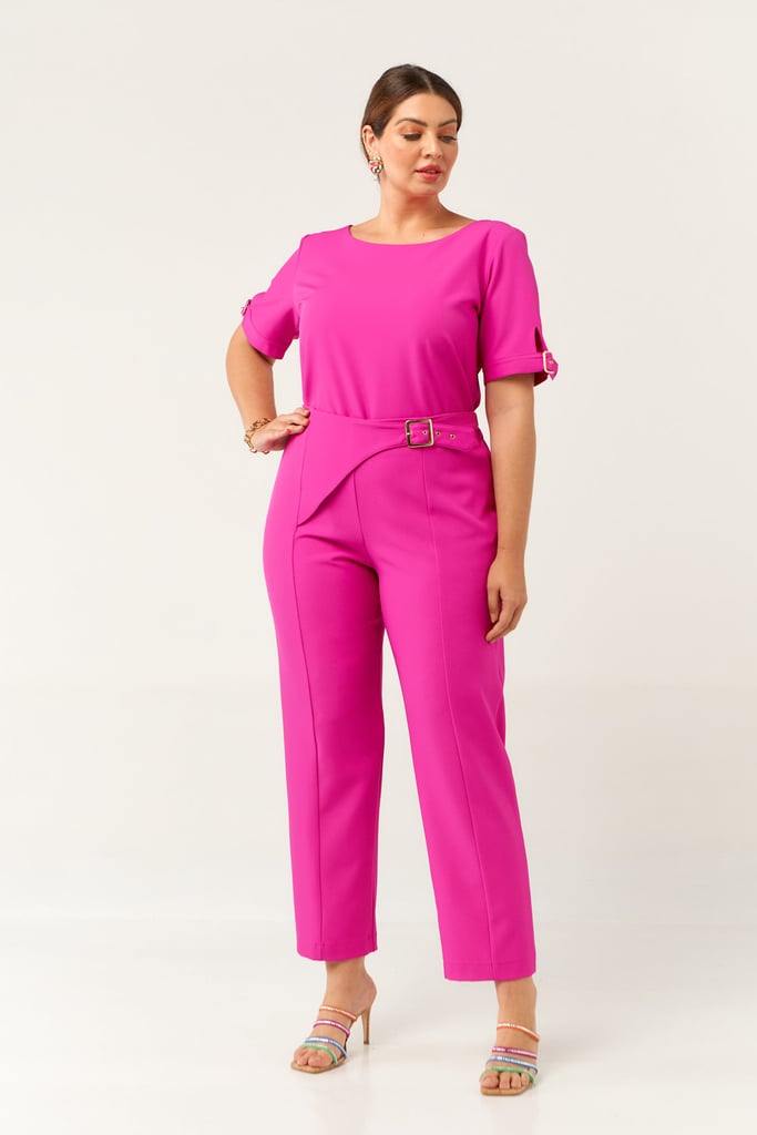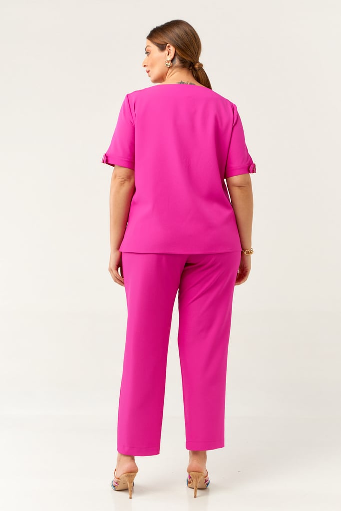 Conjunto confeccionado no crepe encorpado. Blusa possui decote arredondado e manga curta. Calça possui modelagem reta e cós com elástico nas costas para maior conforto. Os detalhes de fivela tanto nas mangas quanto no cós dão todo charme à peça.
