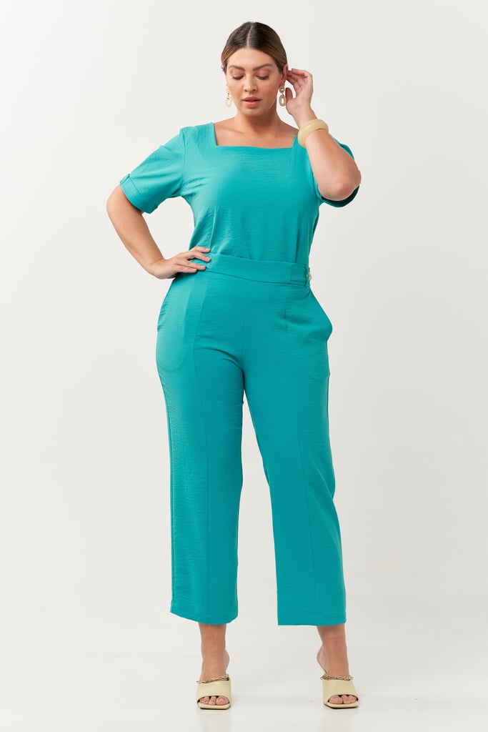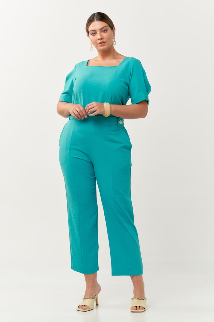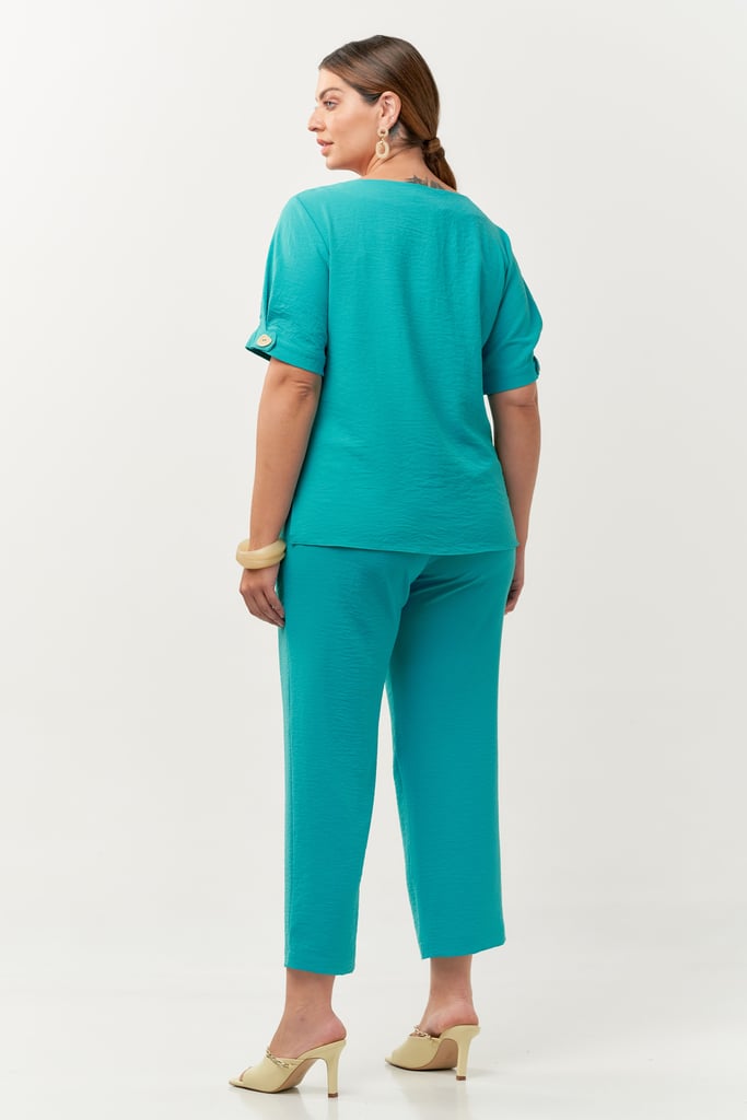Conjunto confeccionado no crepe com aspecto enrugado. Blusa possui decote quadrado e manga curta com detalhe de dobradura e botão. Calça possui modelagem reta com recorte frontal, cós com botões decorativos e costas com elástico para maior conforto.