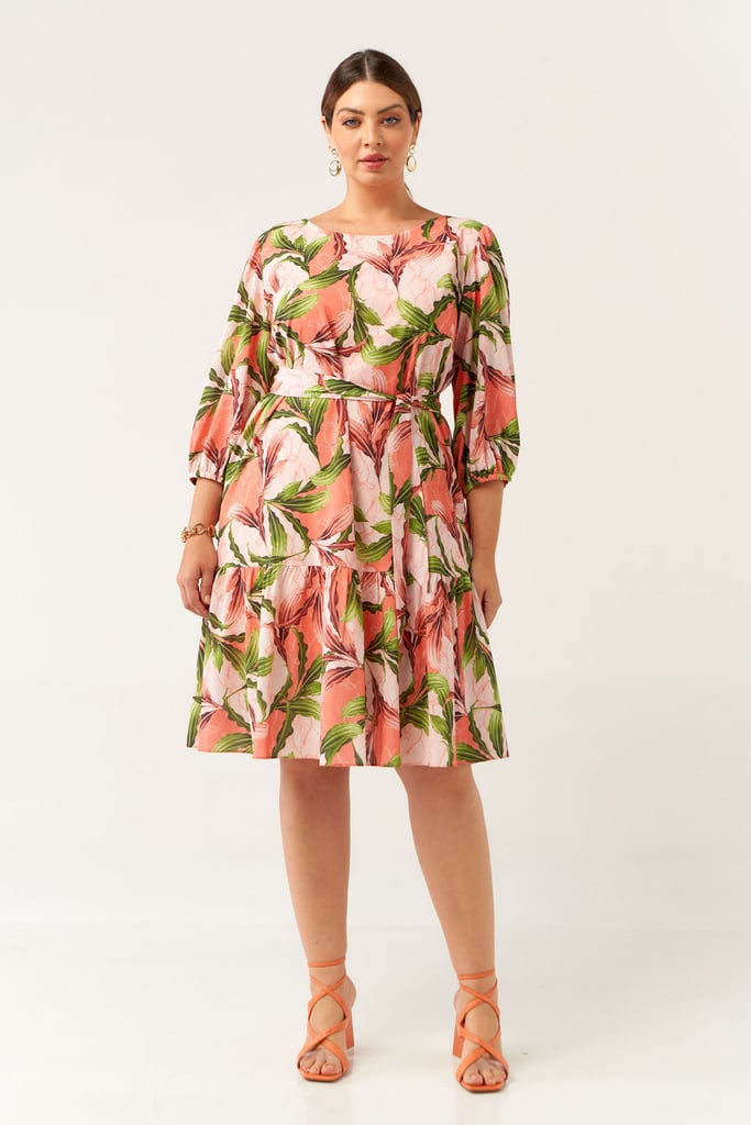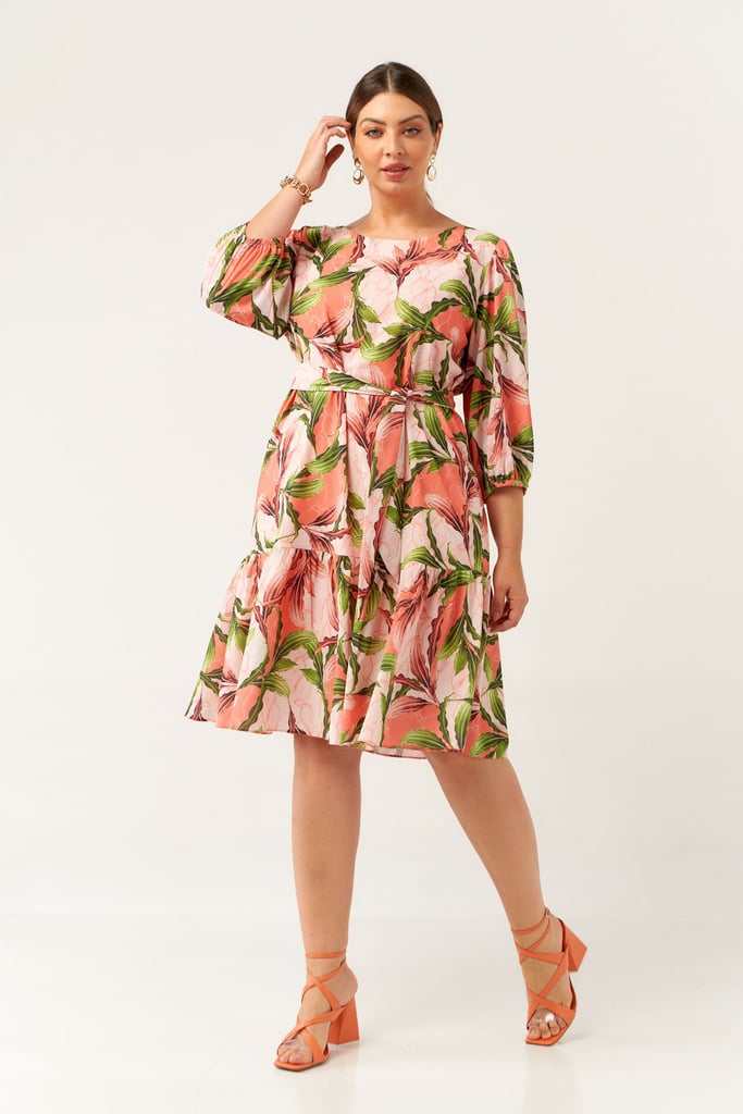 Vestido de crepe com estamparia exclusiva. Possui decote arredondado, manga 3/4 com terminação de elástico e detalhe de babado na barra. Peça forrada. Acompanha cinto-faixa do mesmo tecido.