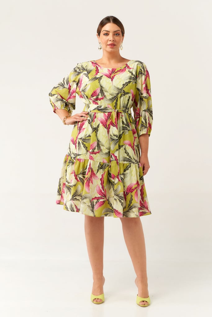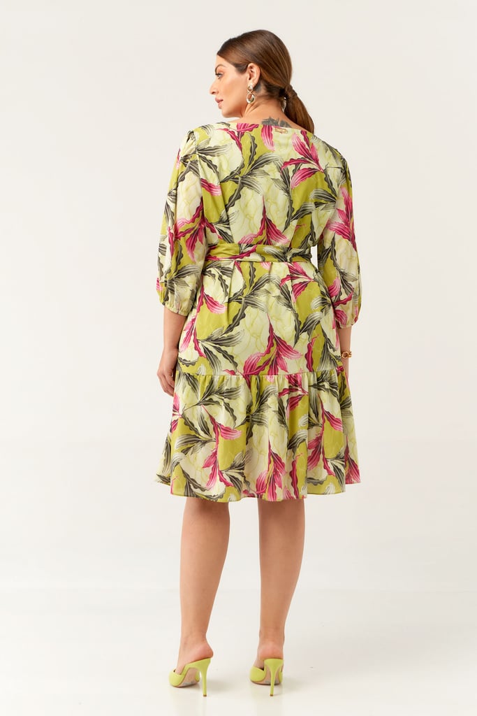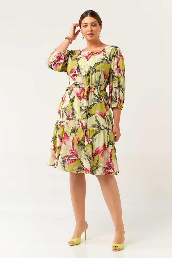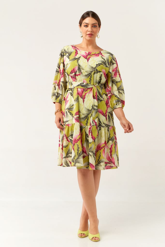 Vestido de crepe com estamparia exclusiva. Possui decote arredondado, manga 3/4 com terminação de elástico e detalhe de babado na barra. Peça forrada. Acompanha cinto-faixa do mesmo tecido.