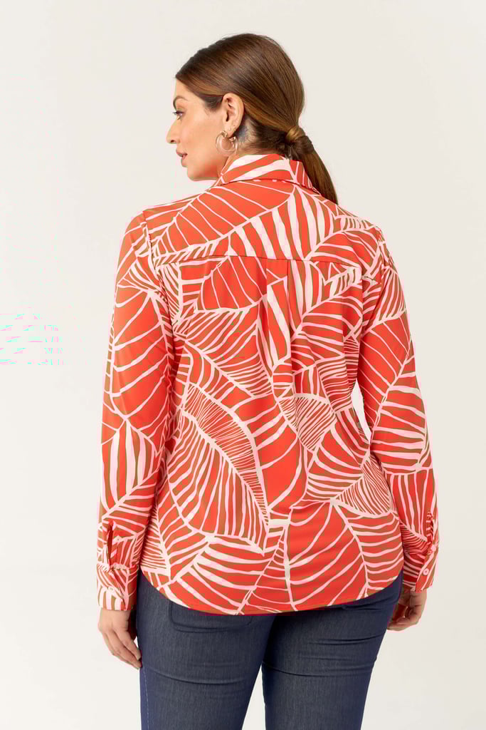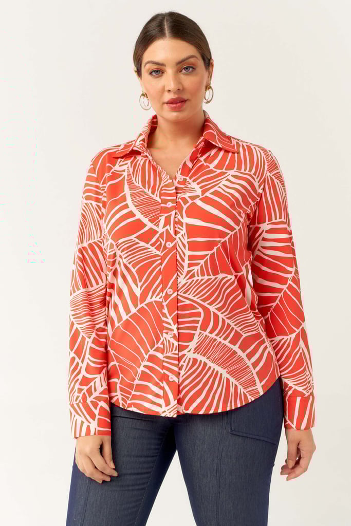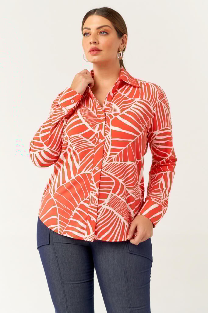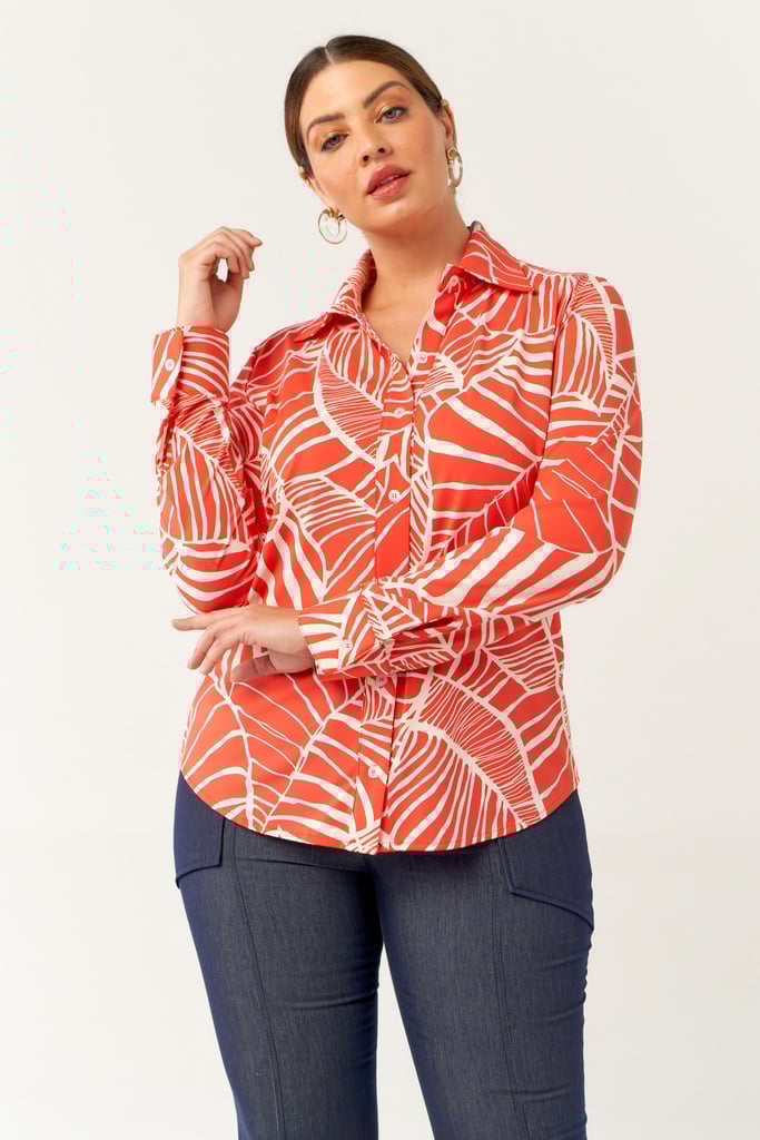 Camisa confeccionada em tecido de Fluity com estampa exclusiva. Possui gola de camisa, vista, manga comprida com punho fechada por botões frontais