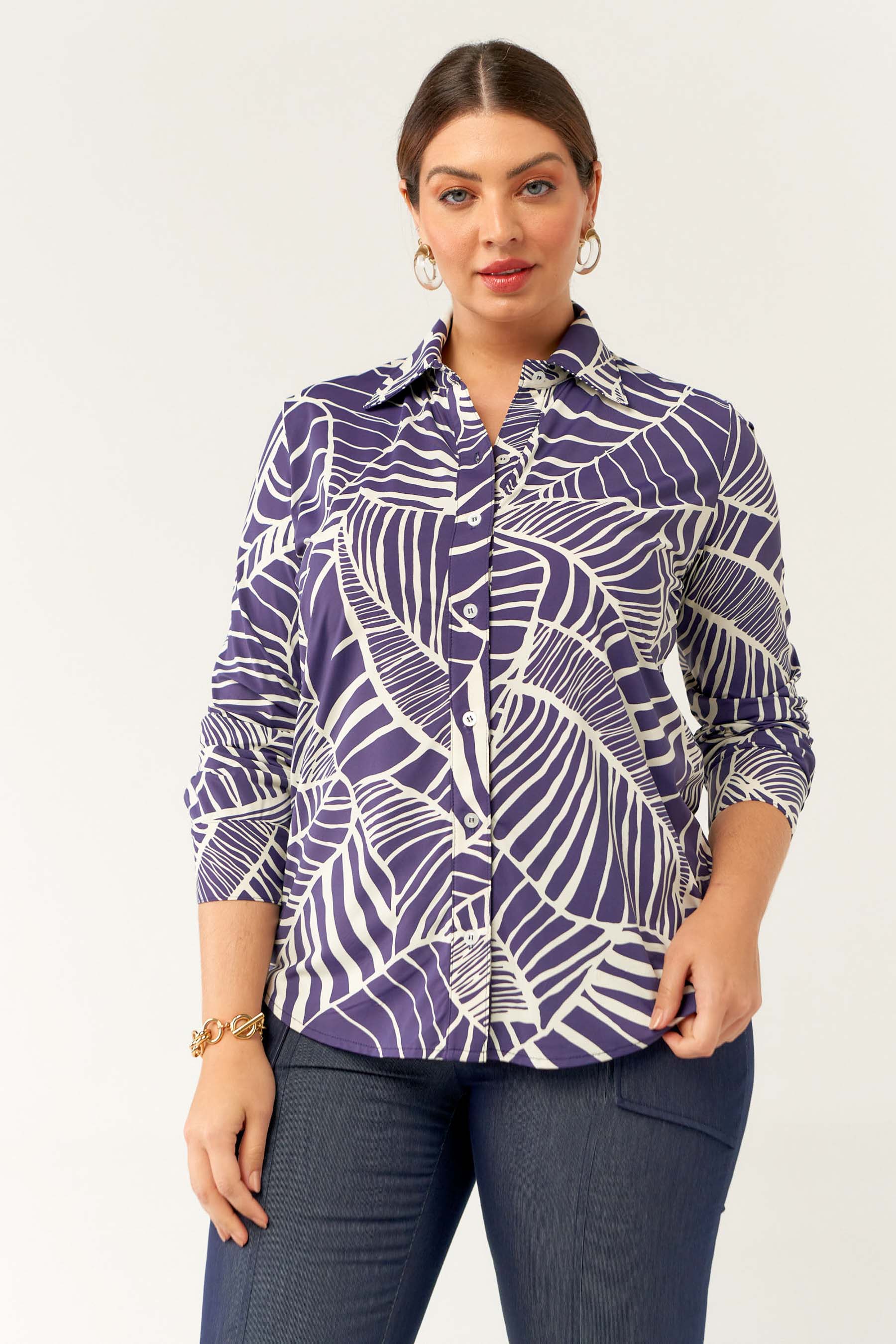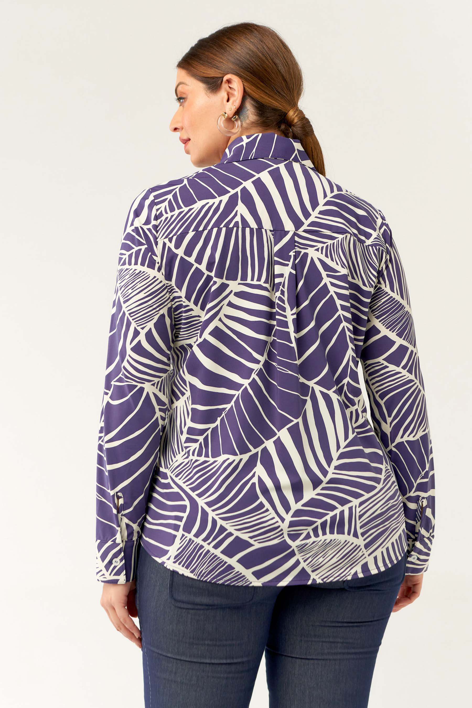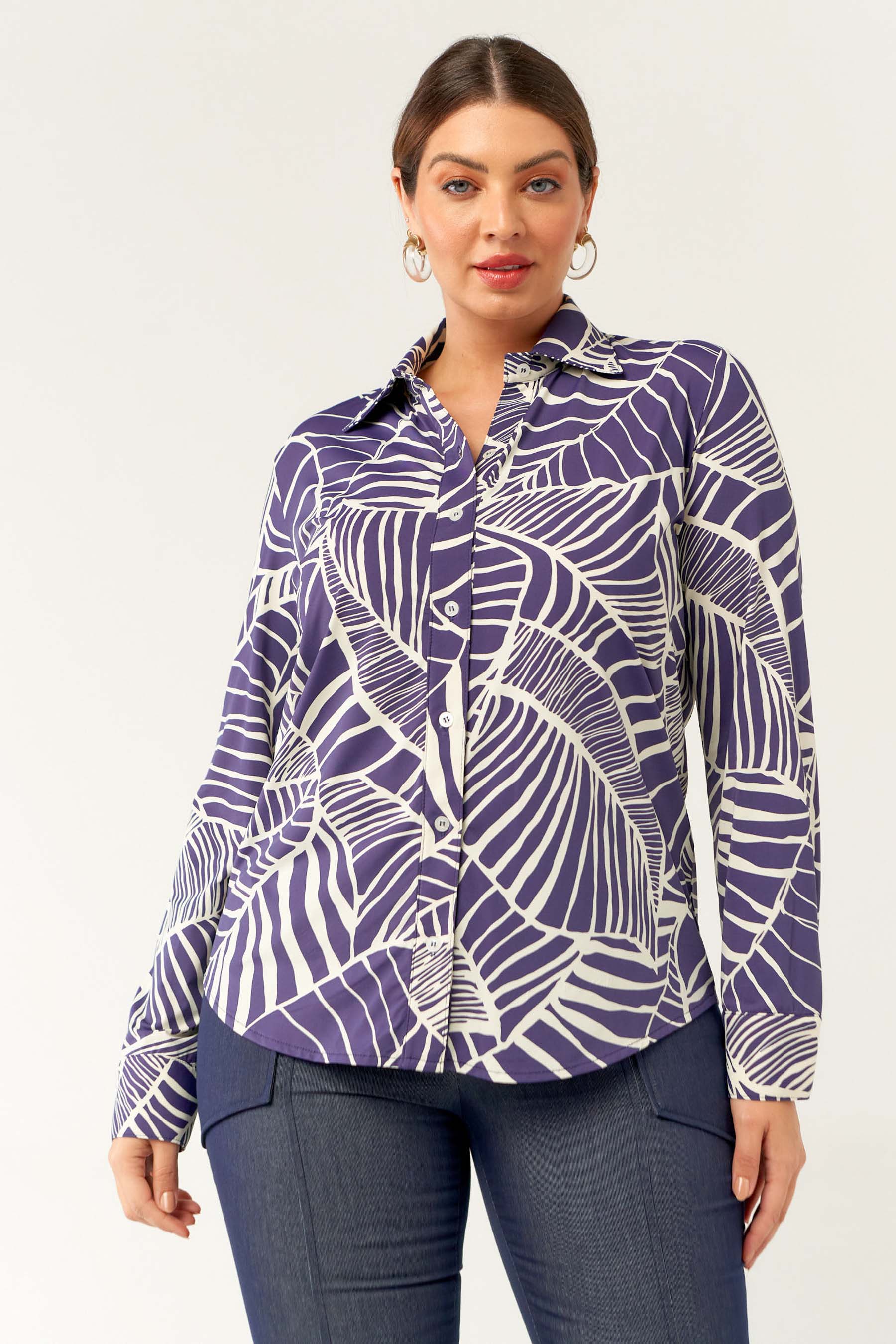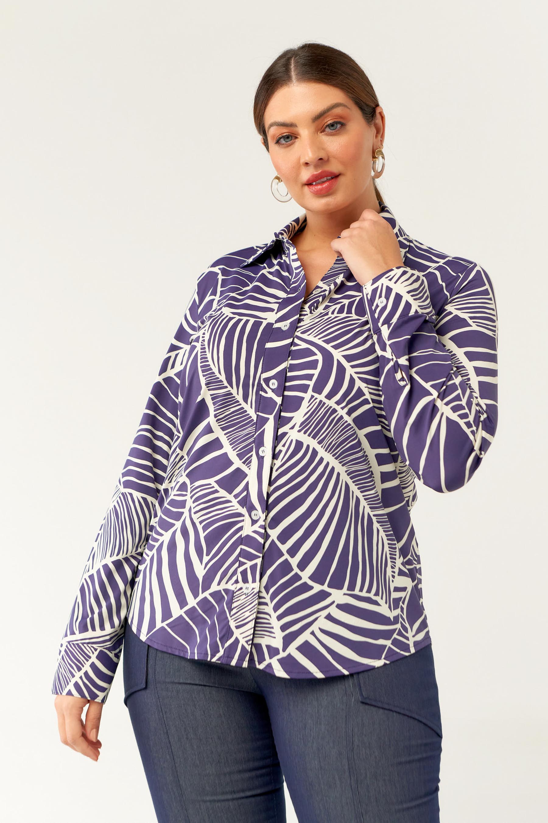Camisa confeccionada em tecido de Fluity com estampa exclusiva. Possui gola de camisa, vista, manga comprida com punho fechada por botões frontais