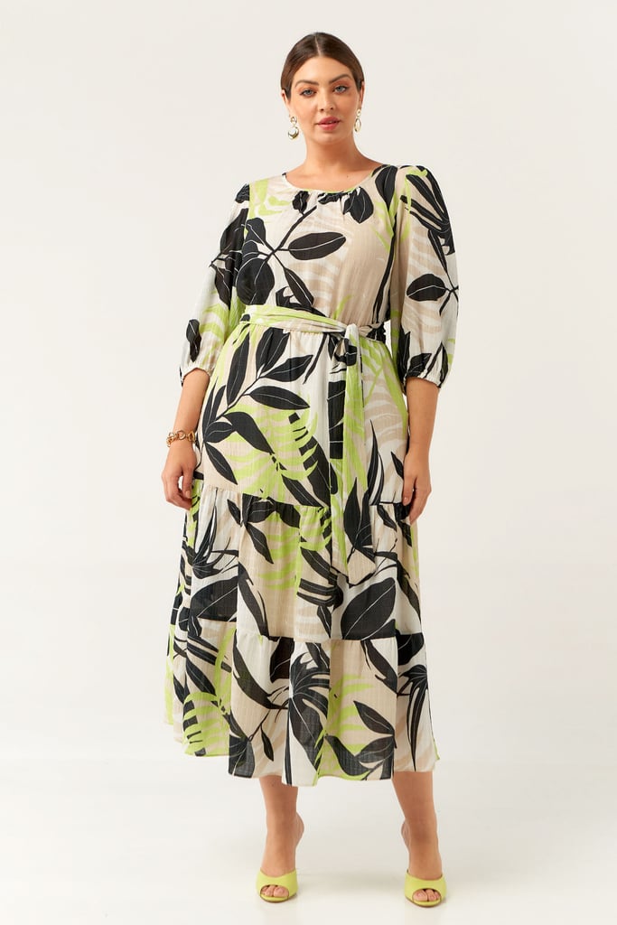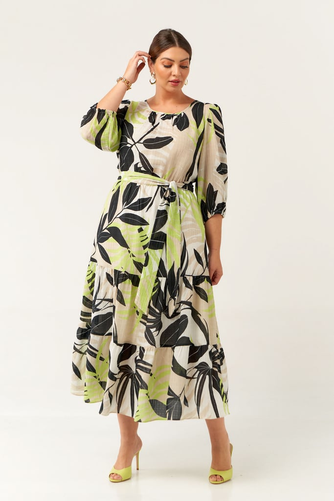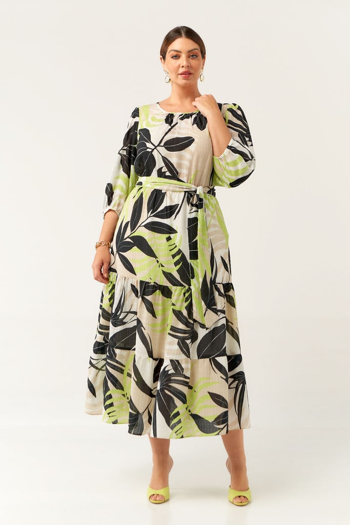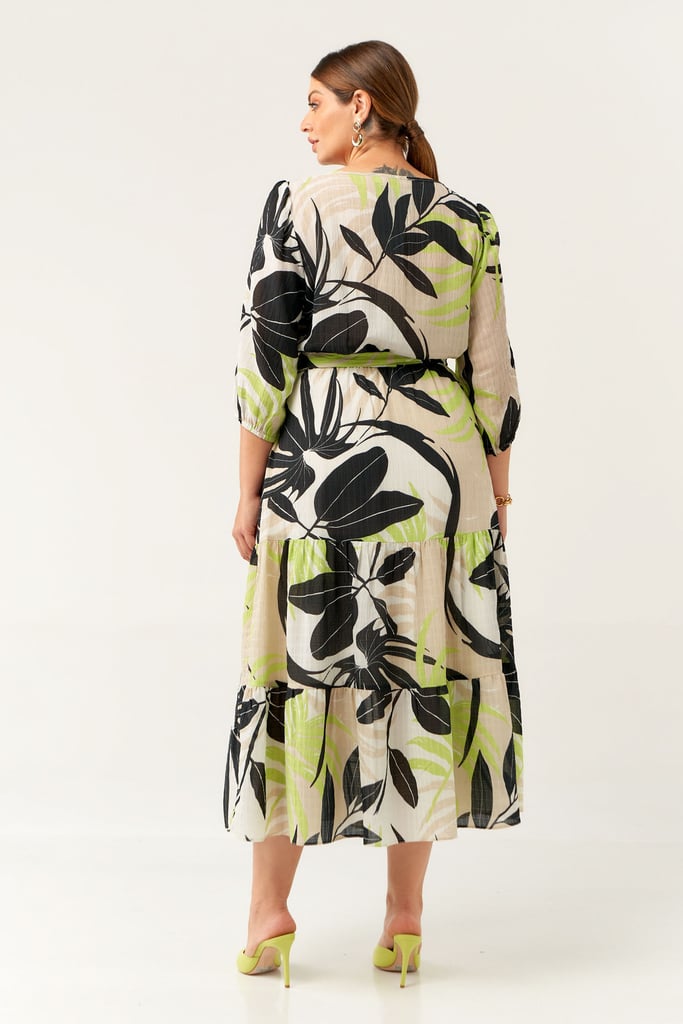 Vestido confeccionado em tecido texturizado tipo anaruga. Possui decote arredondado, manga 3/4 com elástico, elástico na cintura e detalhe de babados na saia. Possui forro. Acompanha faixa do mesmo tecido.