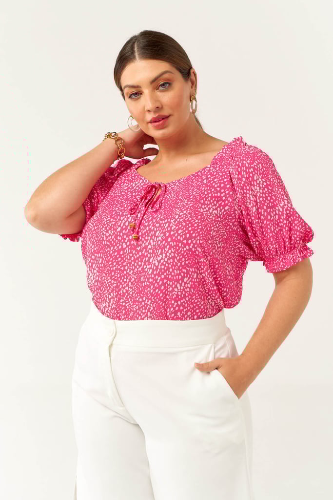 Blusa confeccionada em tecido de crepe estampado. Possui recorte gota no decote com tiras para amarração, detalhe de franzido e pequeno babado nas terminações do ombro e manga.