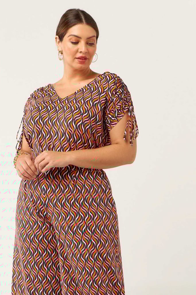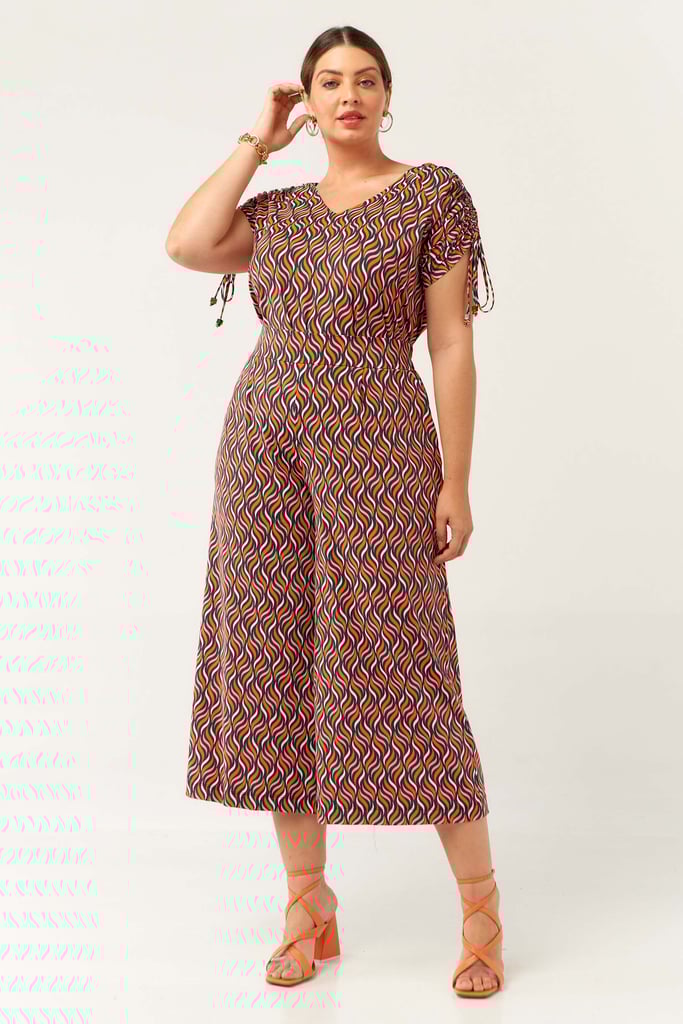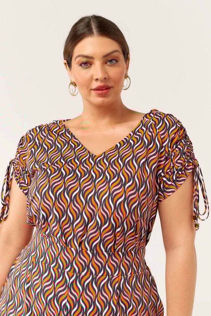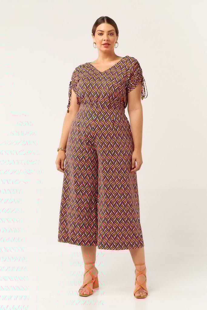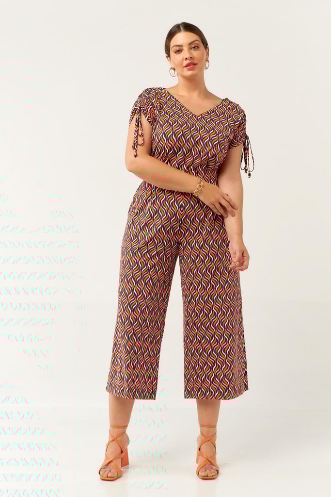 Conjunto confeccionado no Fluity com estampa exclusiva. Blusa possui decote V com detalhe de amarração na manga para regulagem de comprimento da mesma. Calça estilo pantacourt com pregas frontais, bolsos laterais e cós com elástico nas costas para maior conforto. Ideal para os dias mais quentes!