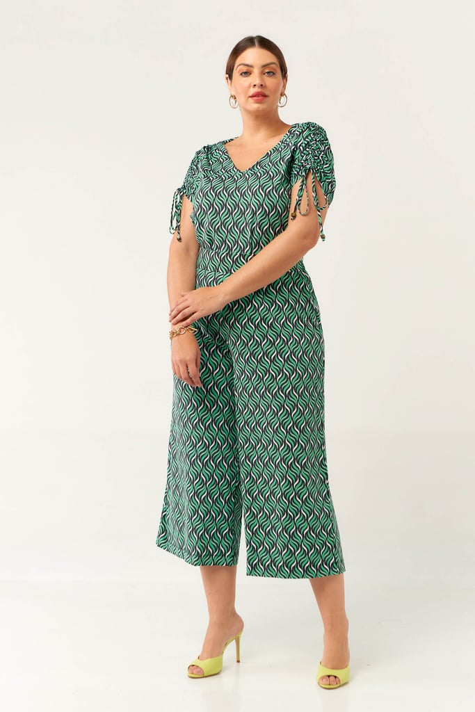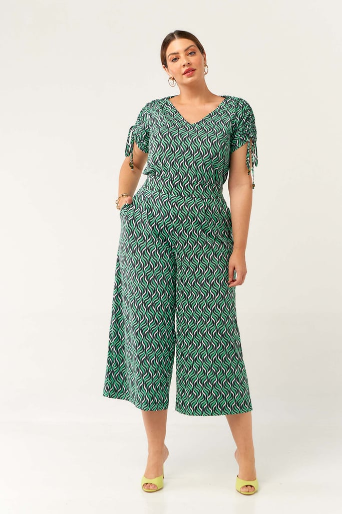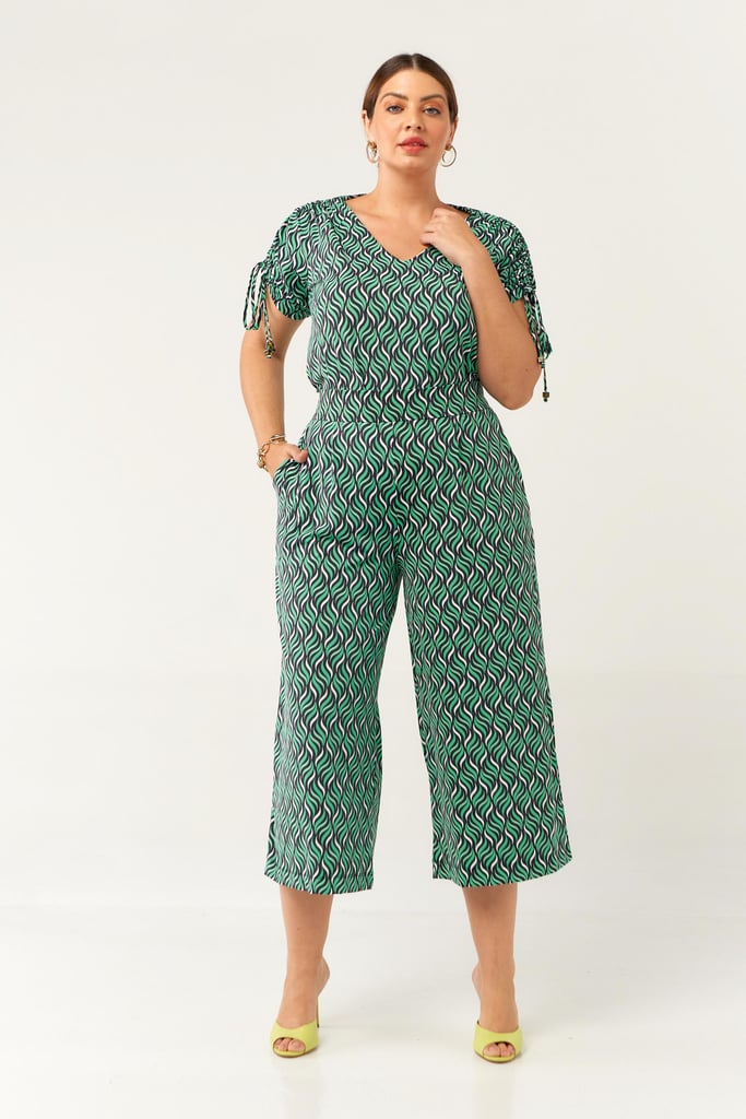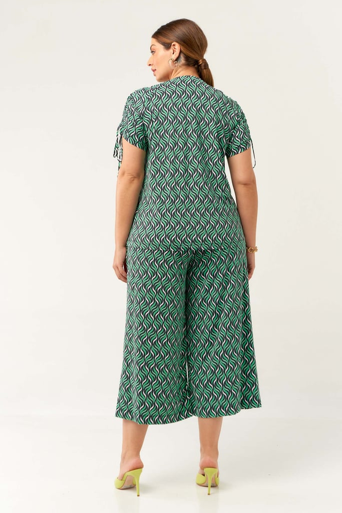 Conjunto confeccionado no Fluity com estampa exclusiva. Blusa possui decote V com detalhe de amarração na manga para regulagem de comprimento da mesma. Calça estilo pantacourt com pregas frontais, bolsos laterais e cós com elástico nas costas para maior conforto. Ideal para os dias mais quentes!