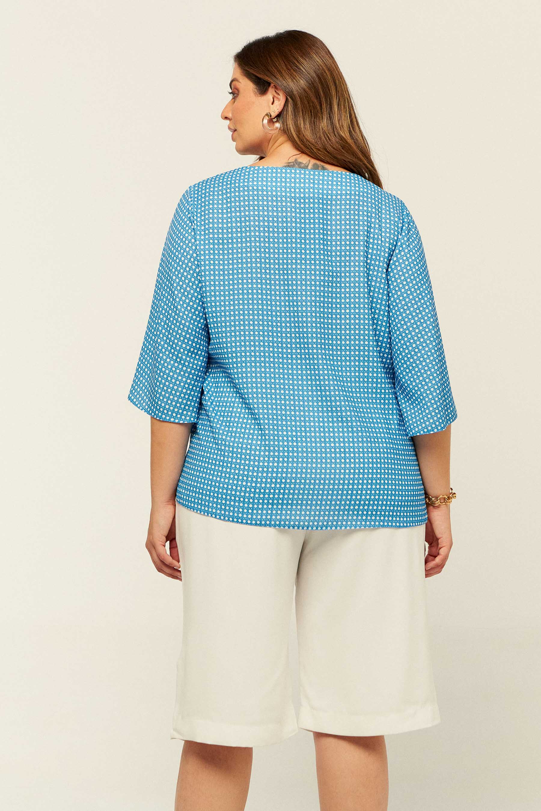 Blusa confeccionada em crepe estampado. Possui decote V com detalhe de aviamento de palha e manga sino 3/4.
