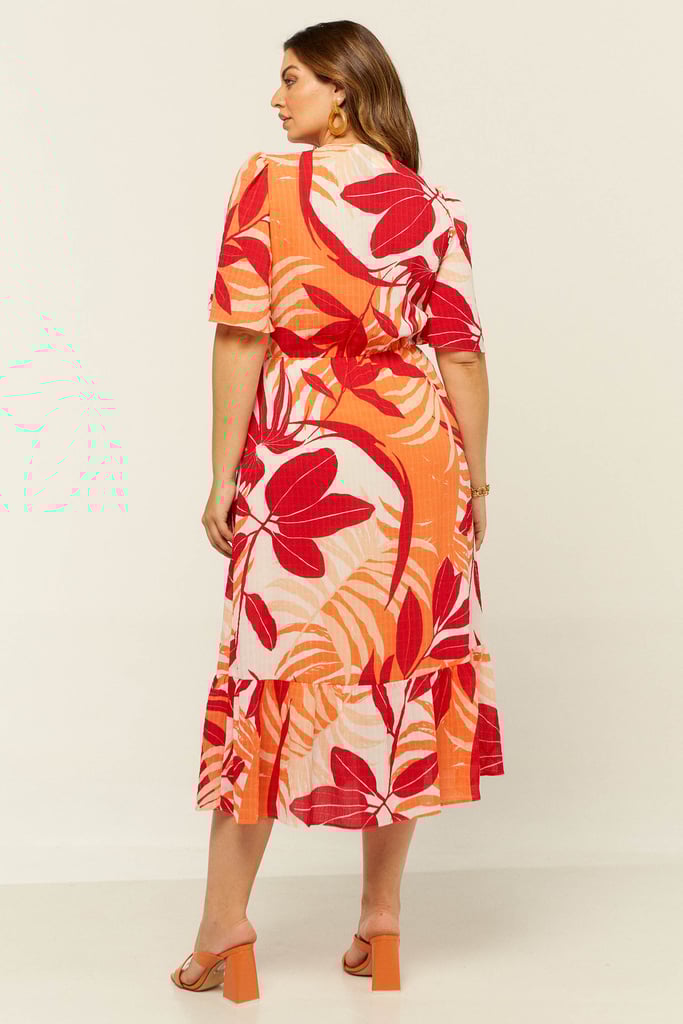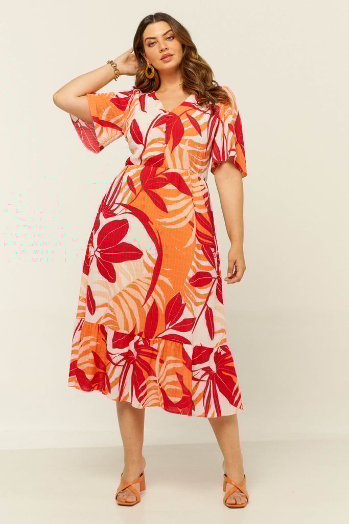 Vestido confeccionado em crepe texturizado estampado estilo anaruga. Possui decote V com botões forrados decorativos e manga sino 3/4. Elástico no cós para efeito blusê. Detalhe de babado na saia que dá todo charme à peça. Possui forro. Vestido perfeito para as festas de fim de ano!