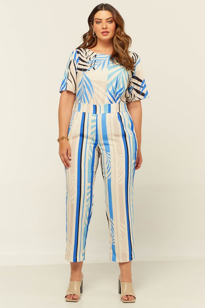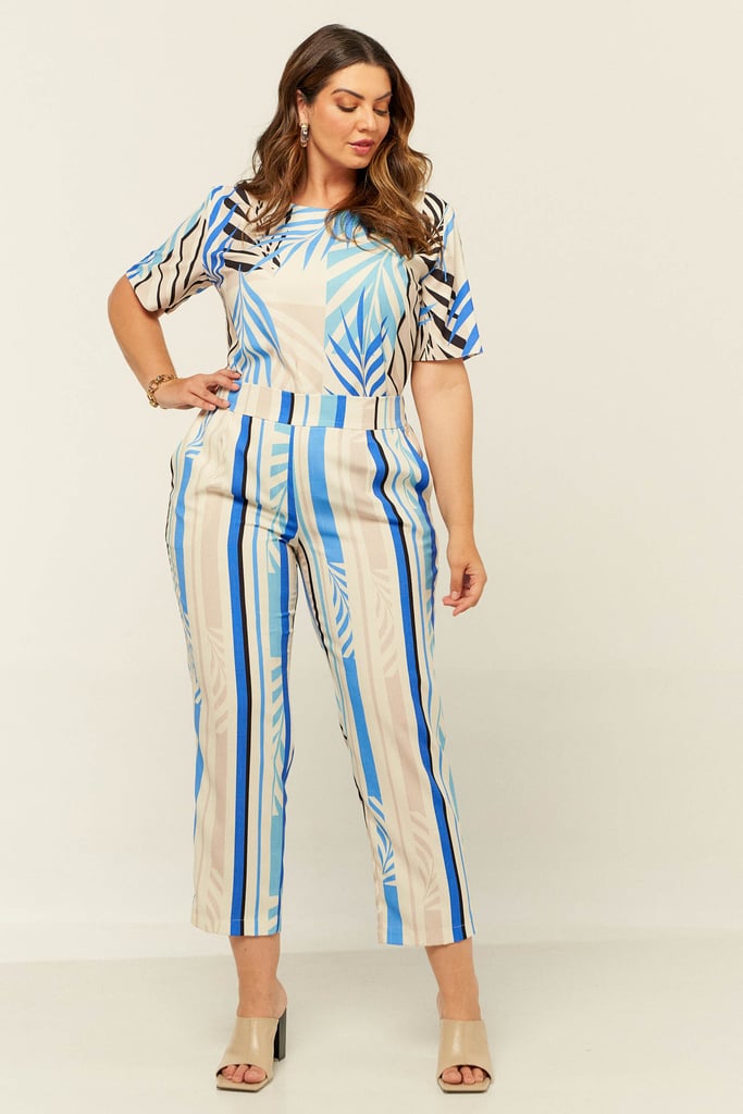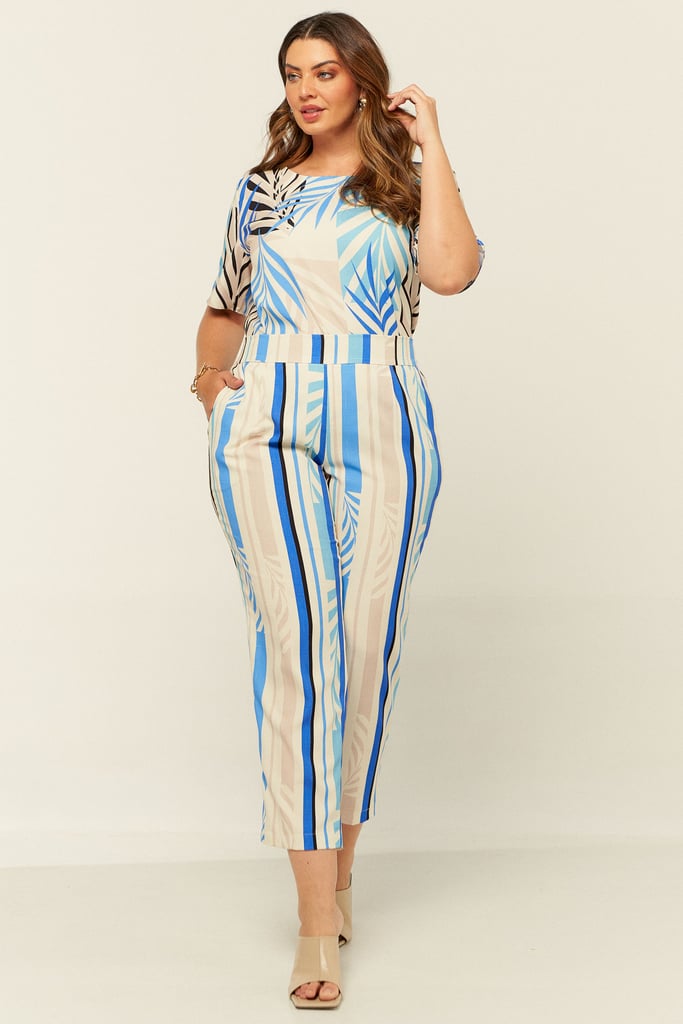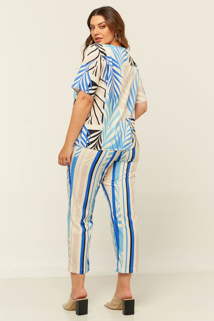 Conjunto confeccionado em crepe com estamparia exclusiva. Blusa possui decote redondo e manga curta. Calça traz nossa modelagem clássica reta com pregas frontais, bolsos laterais e cós com elástico nas costas para maior conforto.