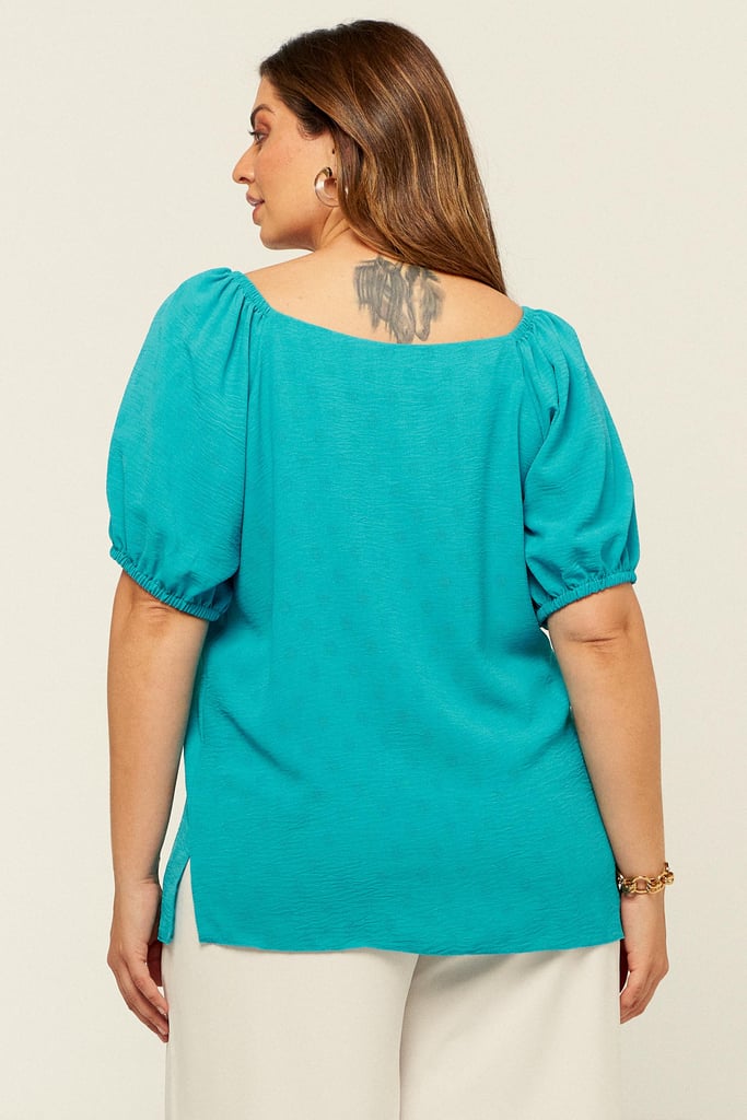 Blusa confeccionada em crepe maquinetado. Possui decote versátil podendo ser usado ombro a ombro e manga raglan com elástico na barra.