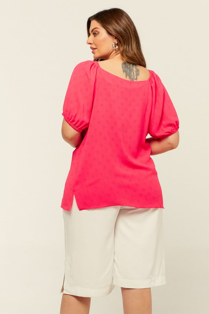 Blusa confeccionada em crepe maquinetado. Possui decote versátil podendo ser usado ombro a ombro e manga raglan com elástico na barra.