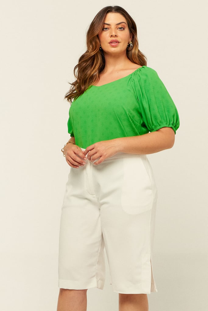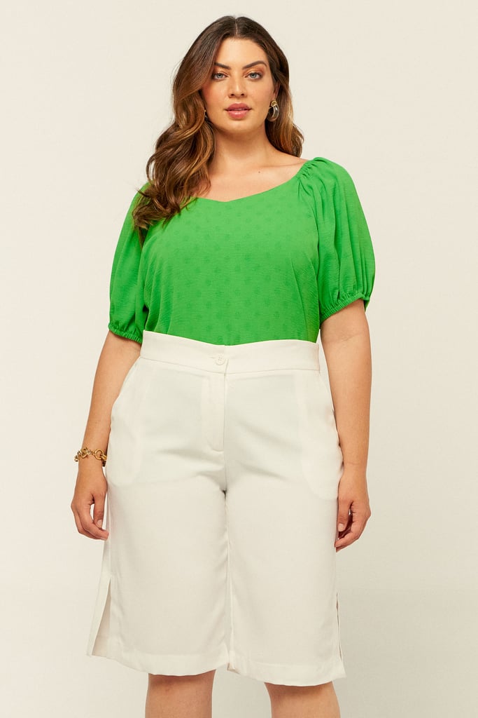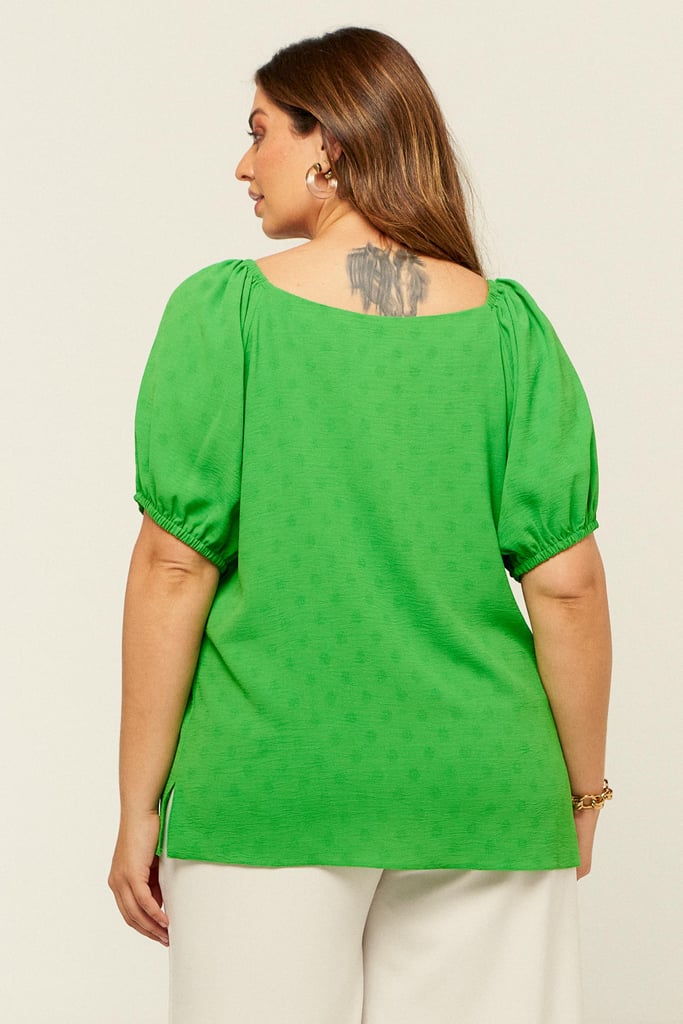 Blusa confeccionada em crepe maquinetado. Possui decote versátil podendo ser usado ombro a ombro e manga raglan com elástico na barra.