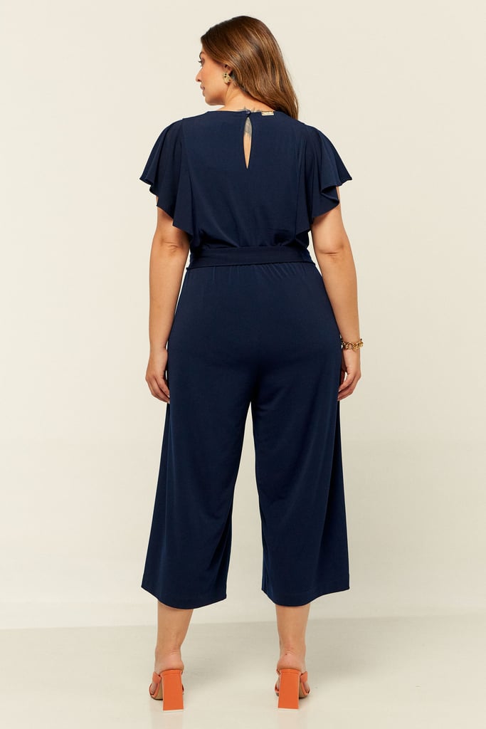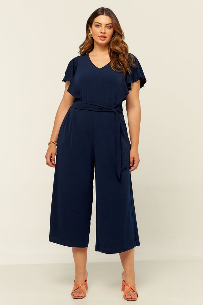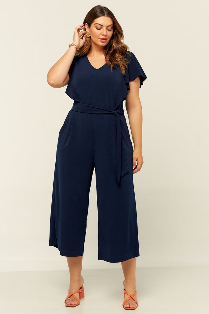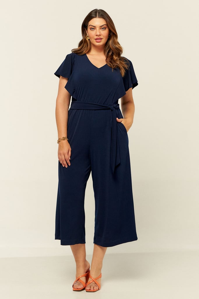 Macacão pantacourt confeccionado em malha creponada. Possui decote redondo, manga de babado e bolsos laterais. A peça também conta com elástico na cintura para efeito blusê. Acompanha faixa do mesmo tecido para amarração.