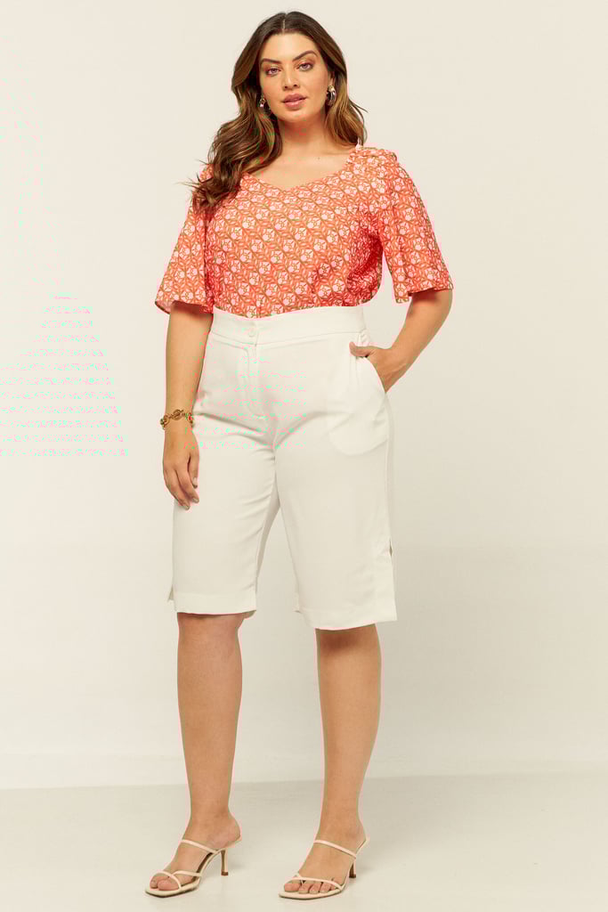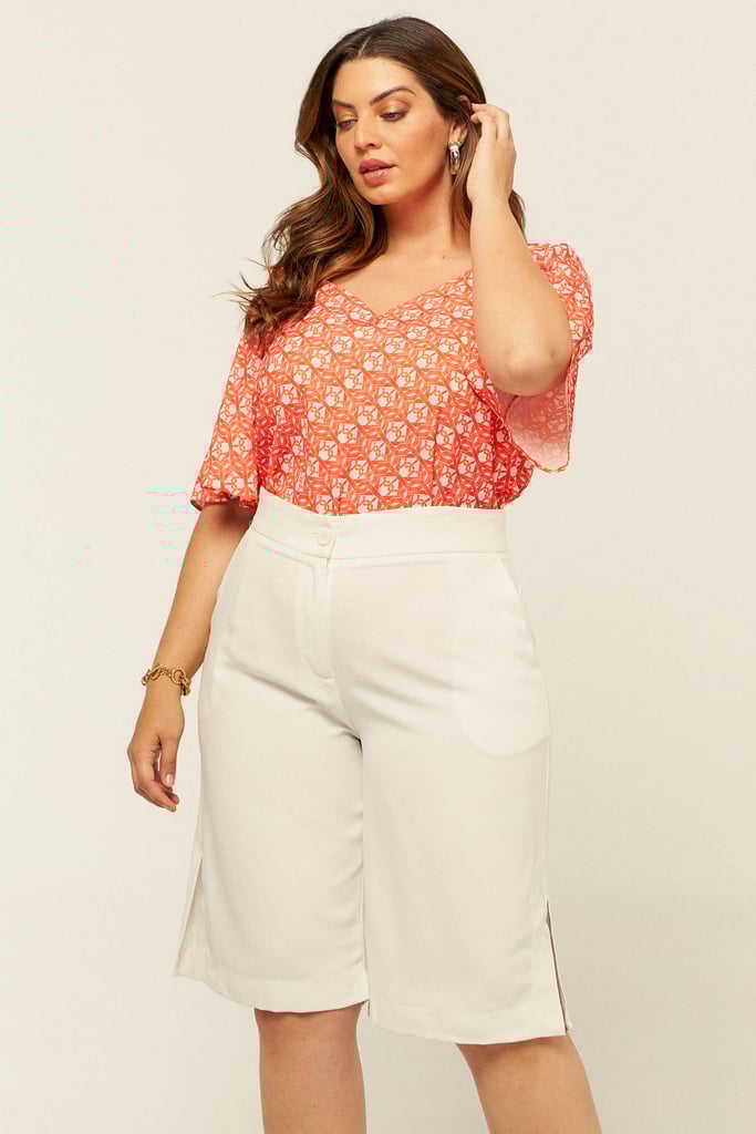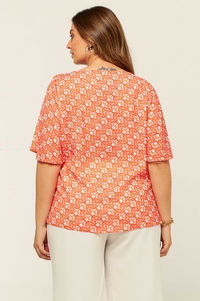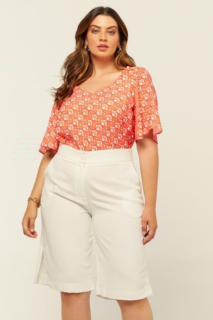 Blusa confeccionada em crepe estampado. Possui decote V com detalhe de elástico e babado no ombro. Mangas sino 3/4.