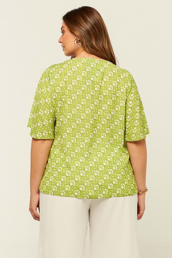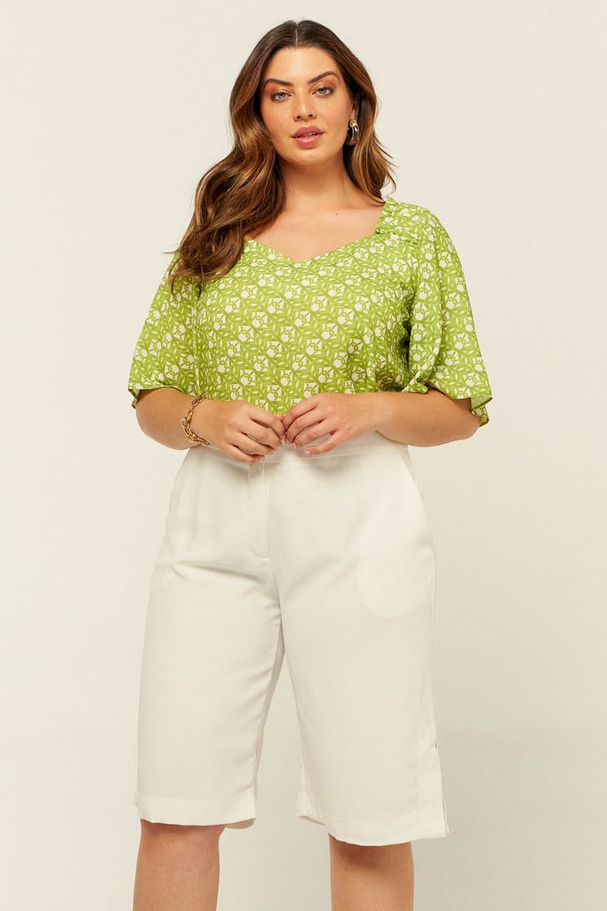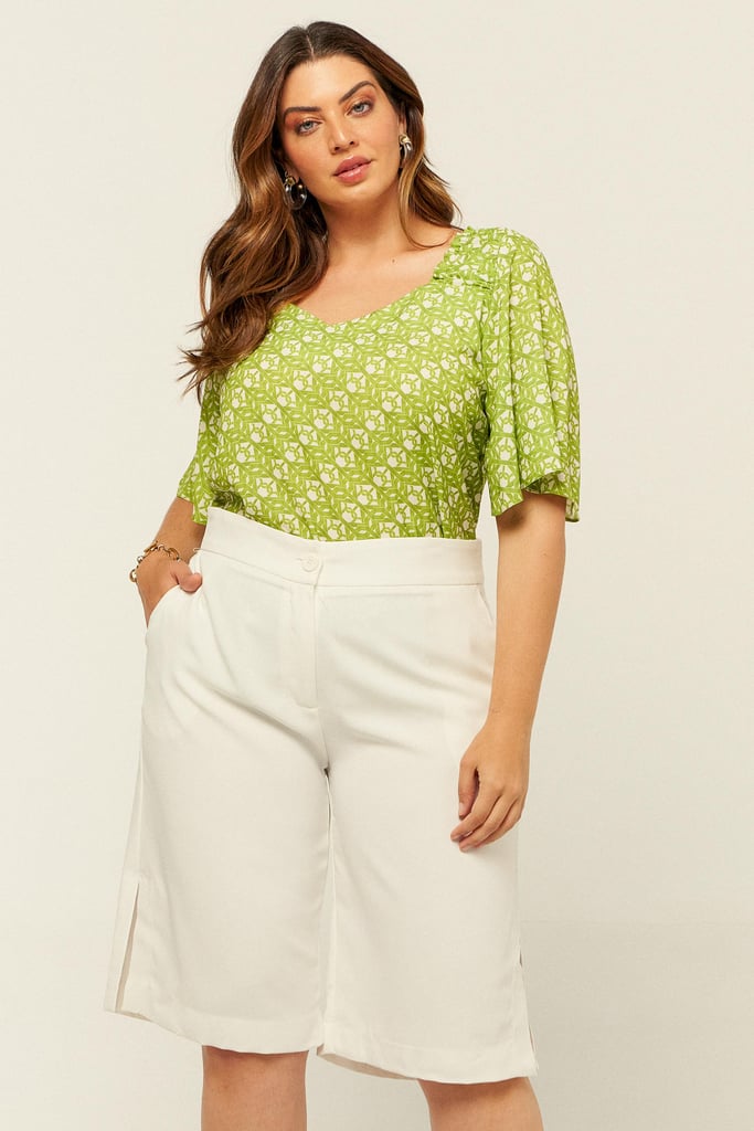 Blusa confeccionada em crepe estampado. Possui decote V com detalhe de elástico e babado no ombro. Mangas sino 3/4.