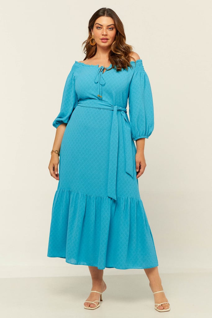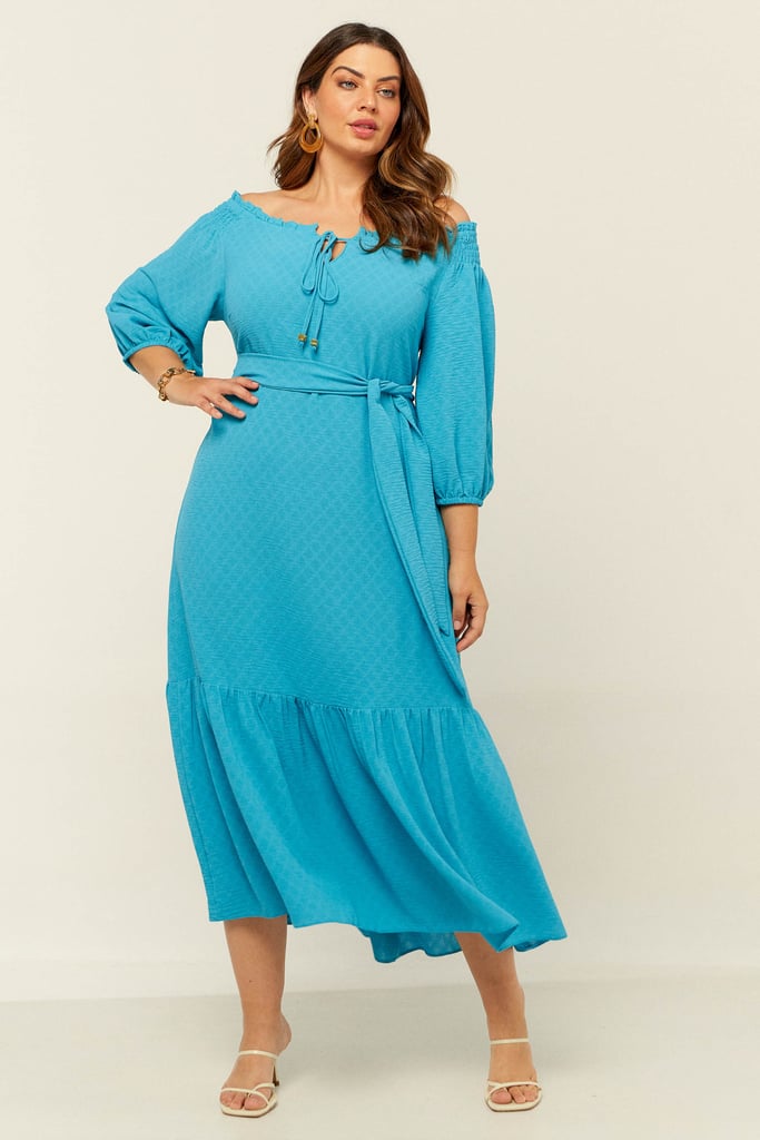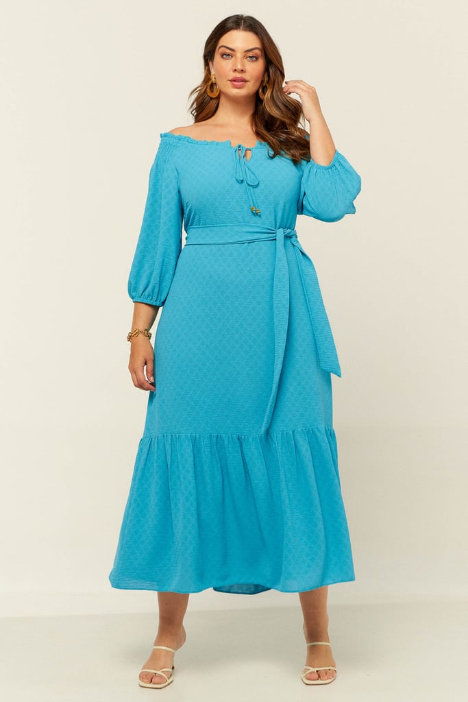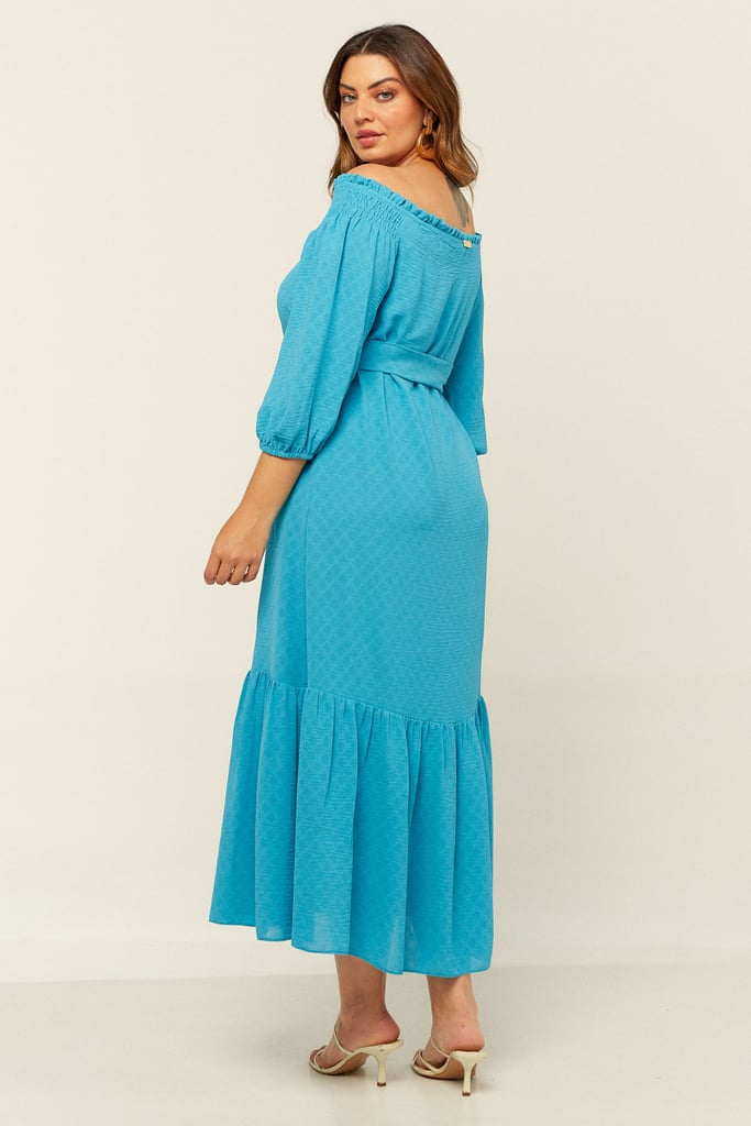 Vestido confeccionado em crepe maquinetado. Possui decote ombro a ombro com amarração. Detalhe de elástico e babado por todo o decote e lastex no ombro. Possui manga 3/4 e babado na saia. Comprimento midi. Acompanha faixa do mesmo tecido para amarração.
