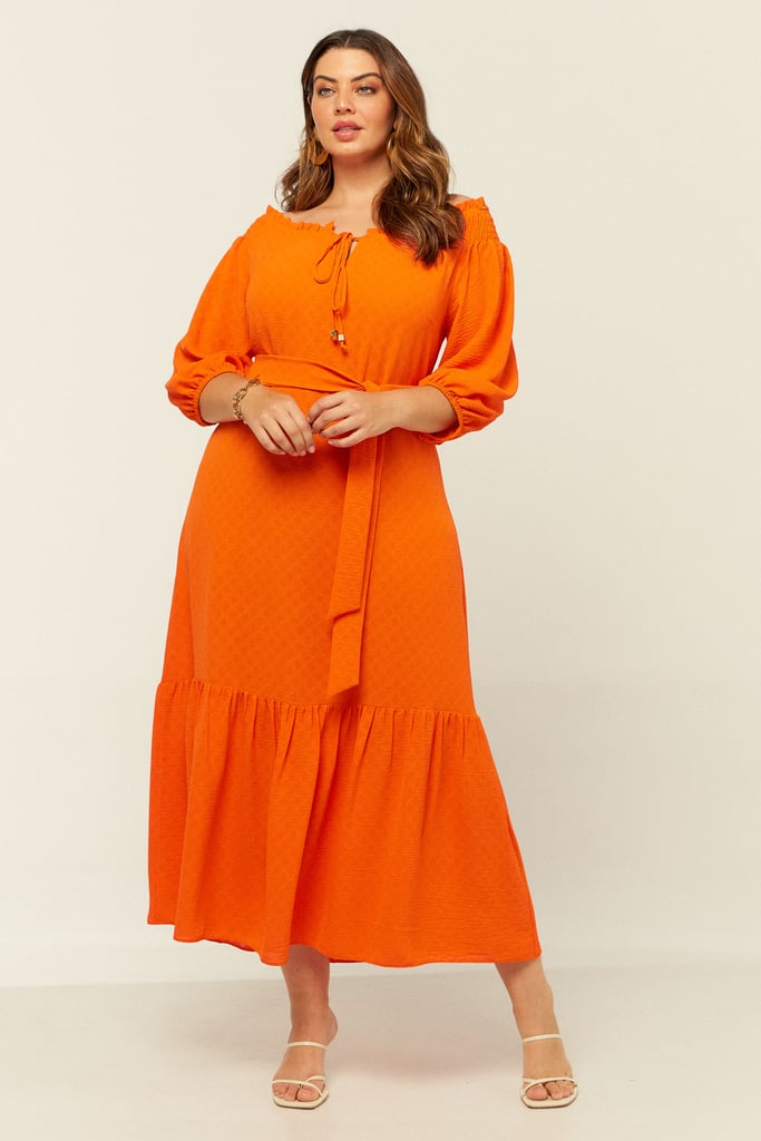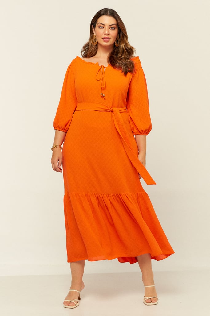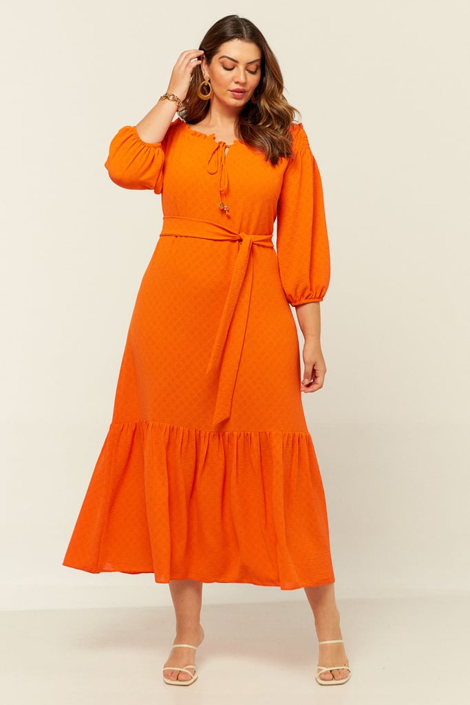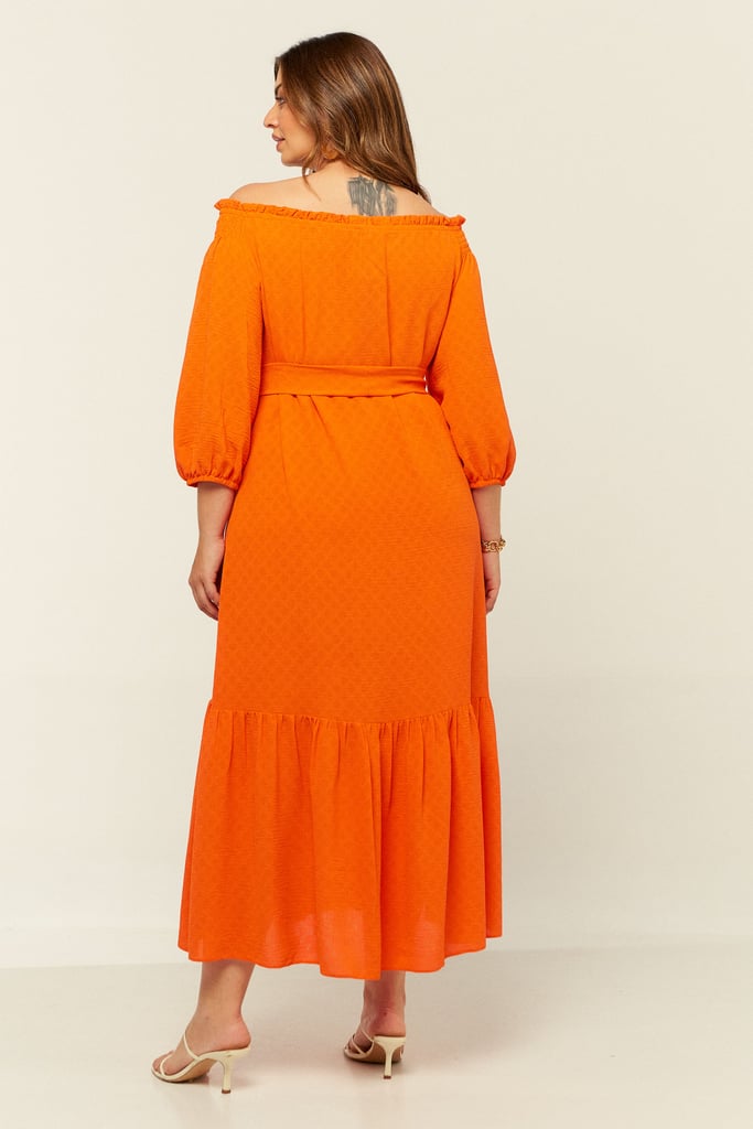 Vestido confeccionado em crepe maquinetado. Possui decote ombro a ombro com amarração. Detalhe de elástico e babado por todo o decote e lastex no ombro. Possui manga 3/4 e babado na saia. Comprimento midi. Acompanha faixa do mesmo tecido para amarração.