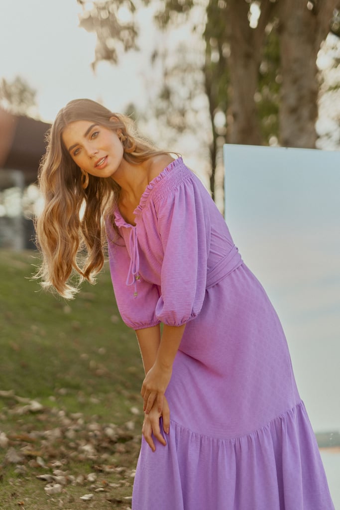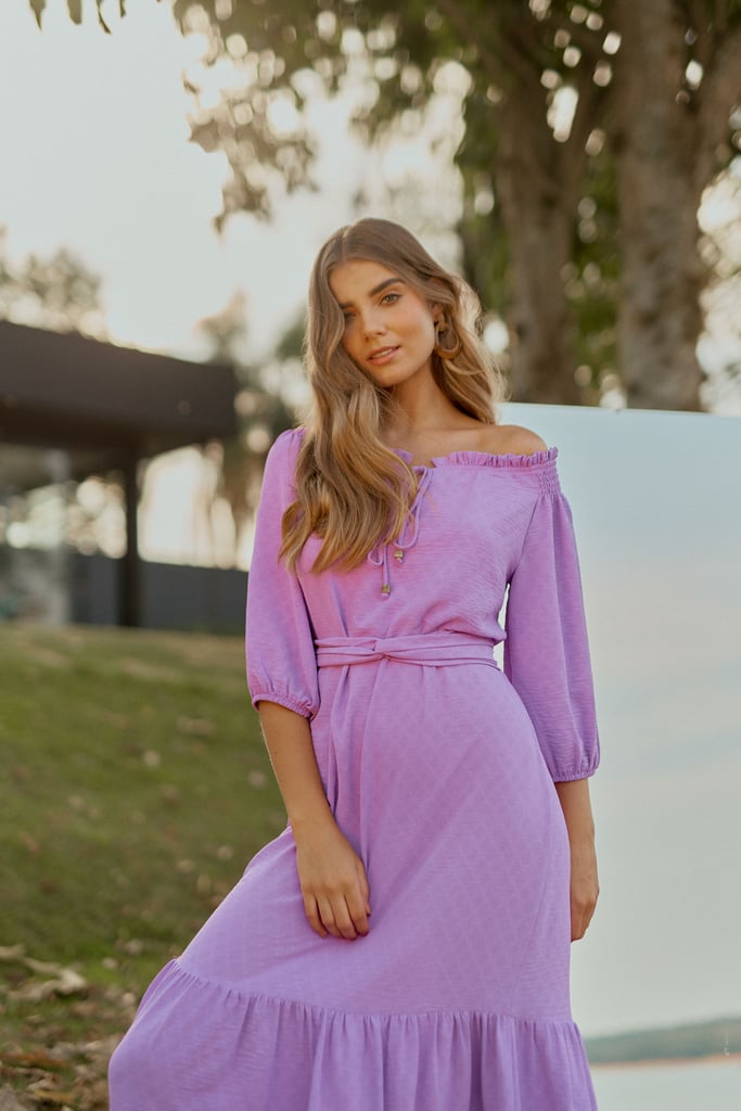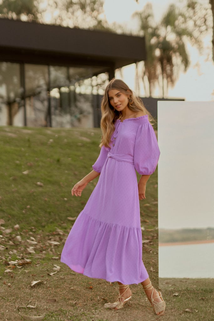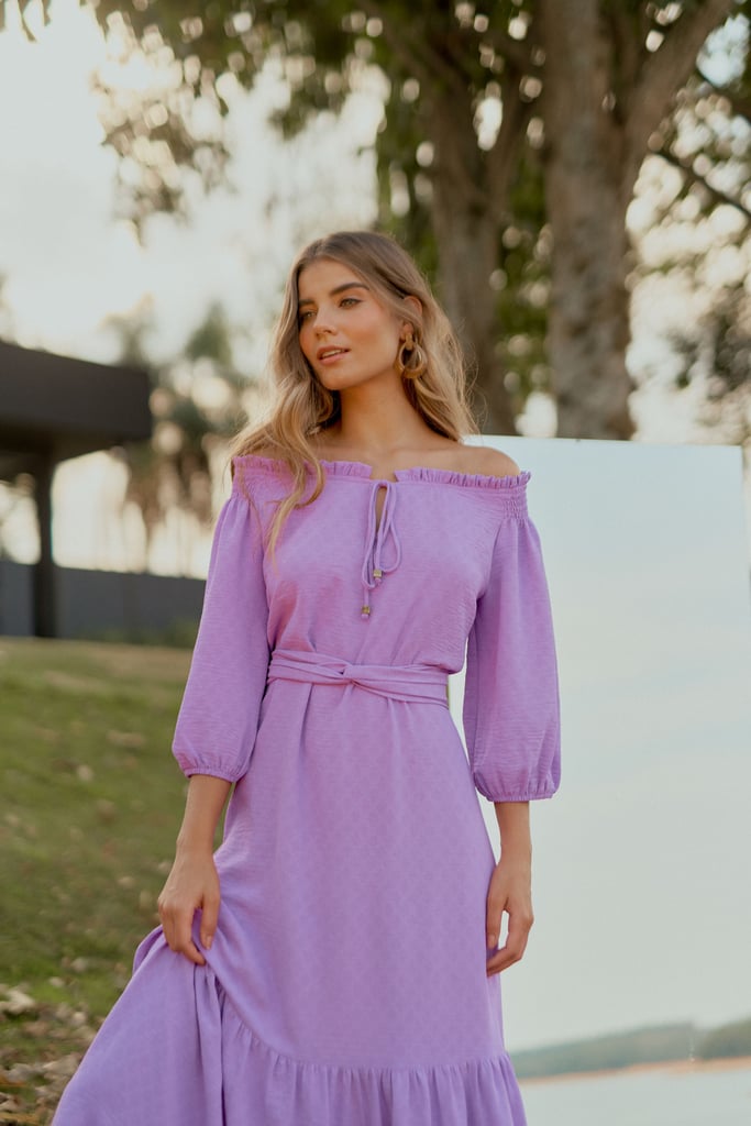 Vestido confeccionado em crepe maquinetado. Possui decote ombro a ombro com amarração. Detalhe de elástico e babado por todo o decote e lastex no ombro. Possui manga 3/4 e babado na saia. Comprimento midi. Acompanha faixa do mesmo tecido para amarração.