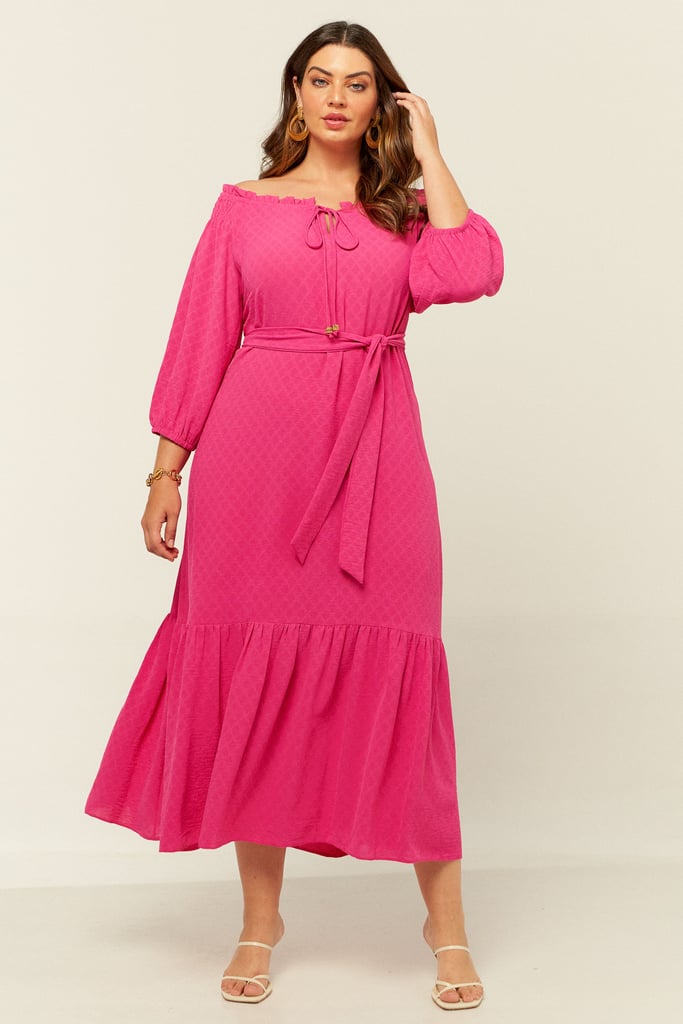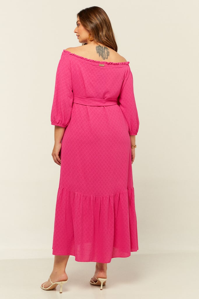 Vestido confeccionado em crepe maquinetado. Possui decote ombro a ombro com amarração. Detalhe de elástico e babado por todo o decote e lastex no ombro. Possui manga 3/4 e babado na saia. Comprimento midi. Acompanha faixa do mesmo tecido para amarração.