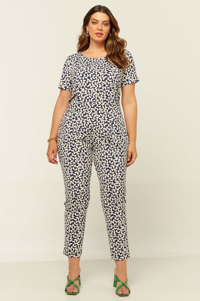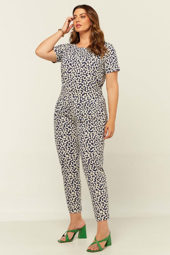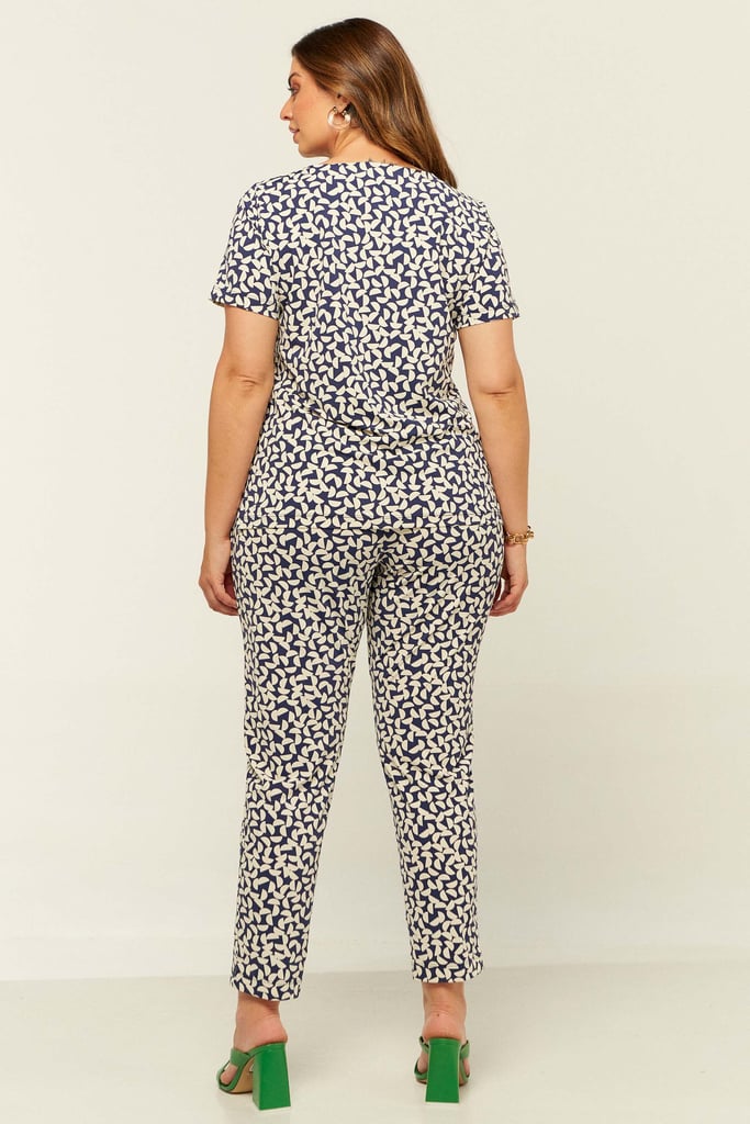 Conjunto confeccionado em Fluity com estamparia exclusiva. A blusa possui decote redondo e manga curta. A calça traz nossa modelagem clássica reta com pregas frontais, bolsos laterais e cós com elástico nas costas para garantir conforto à peça.