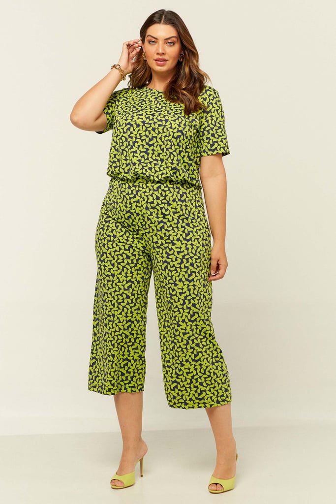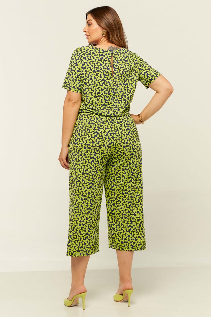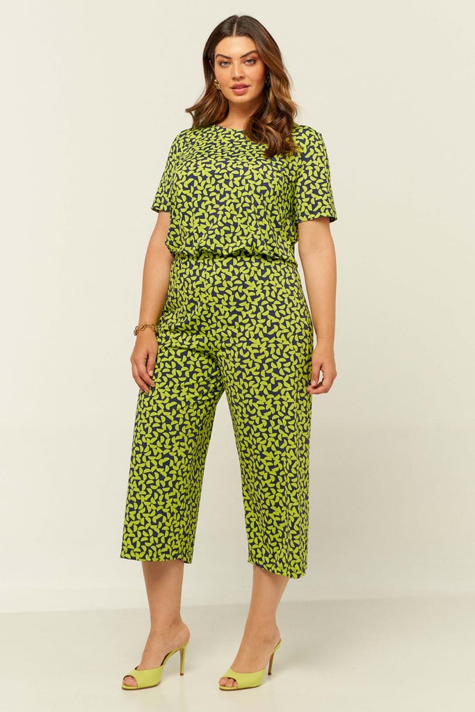 Macacão pantacourt confeccionado em tecido de Fluity. Possui decote redondo e manga curta. Possui elástico na cintura para efeito blusê.