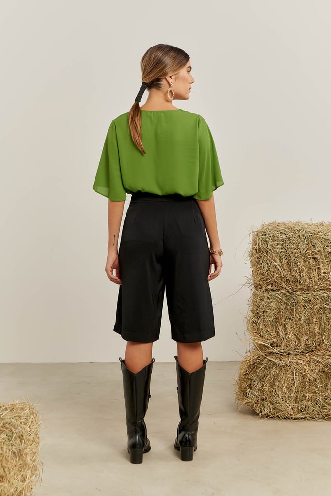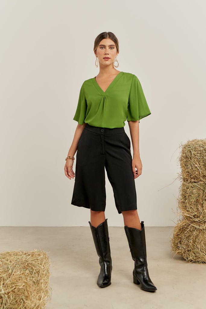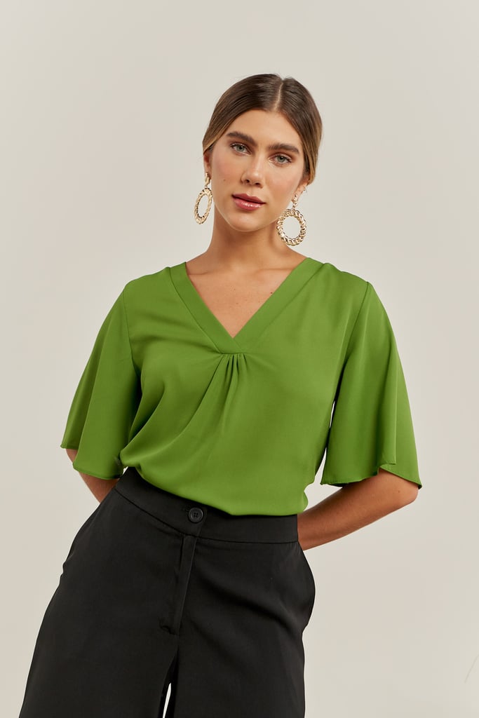 Blusa confeccionada em crepe. Possui decote V com detalhe franzido frontal e manga curta tipo sino.