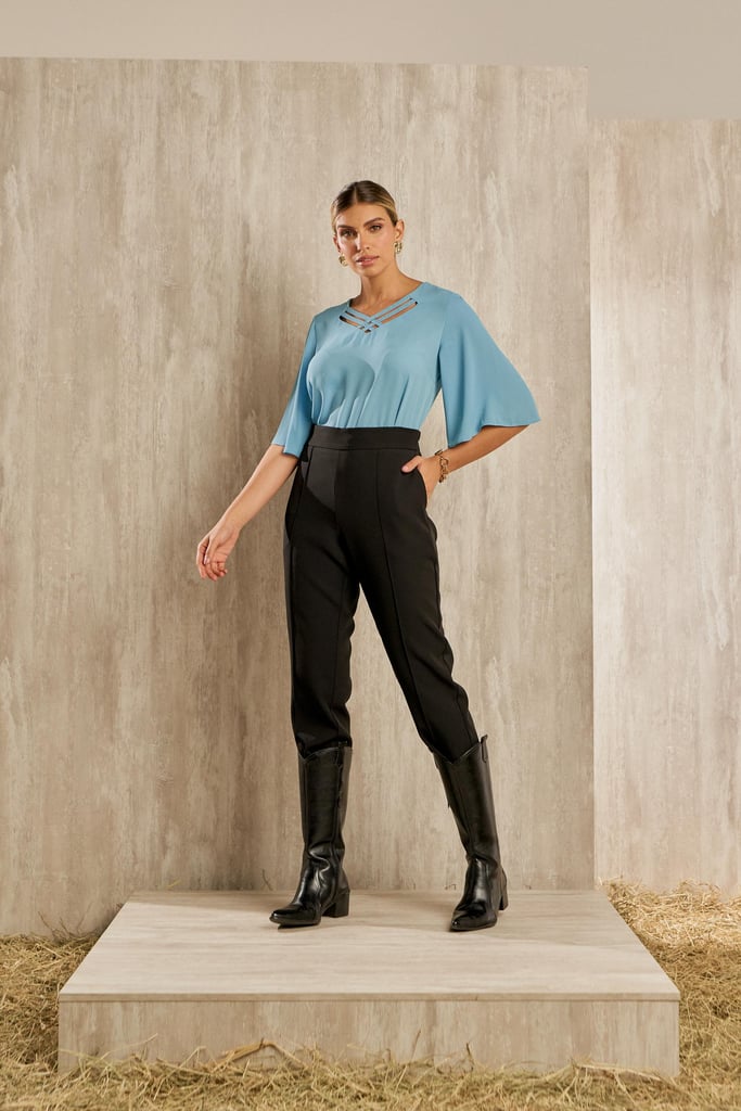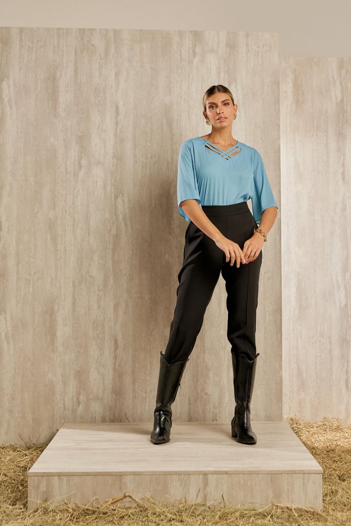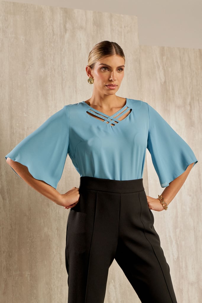 Blusa confeccionada em tecido de crepe. Possui decote V com detalhe de tiras entreleçadas e mangas 3/4 tipo sino.
