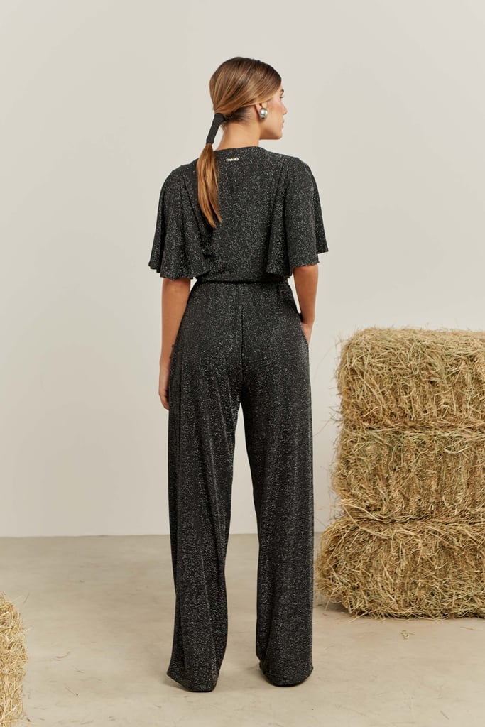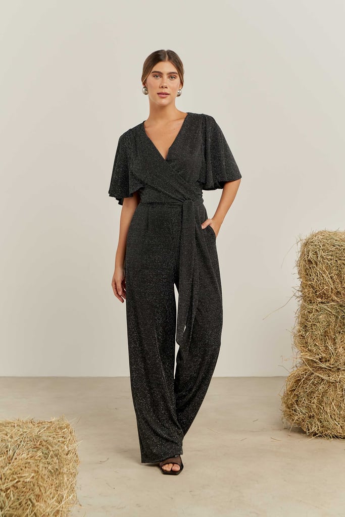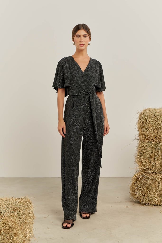 Macacão confeccionado em malha de lurex. Possui decote transpassado, manga godê, elástico na cintura e bolsos laterais. Acompanha faixa do mesmo tecido para amarração.