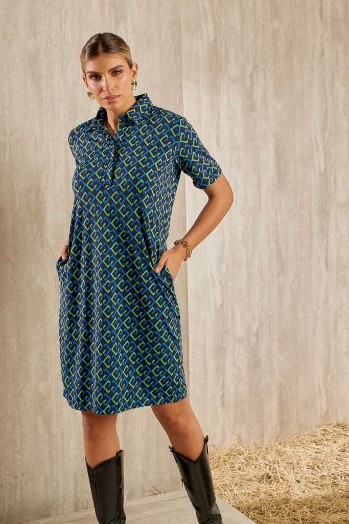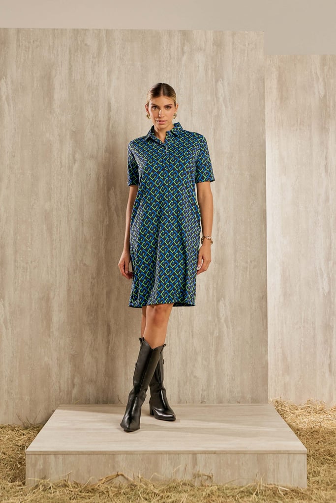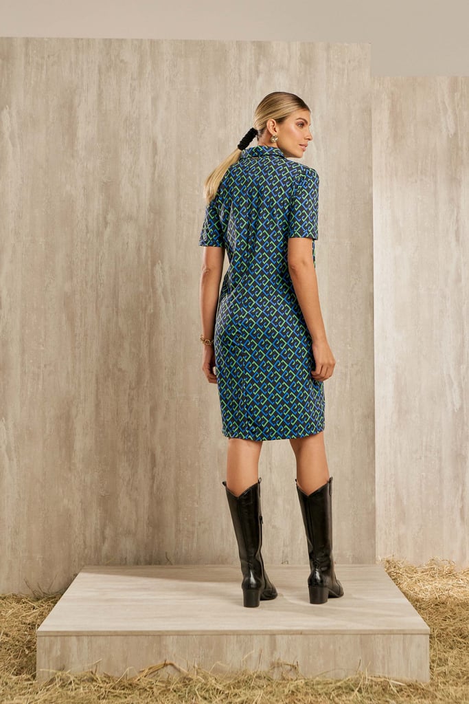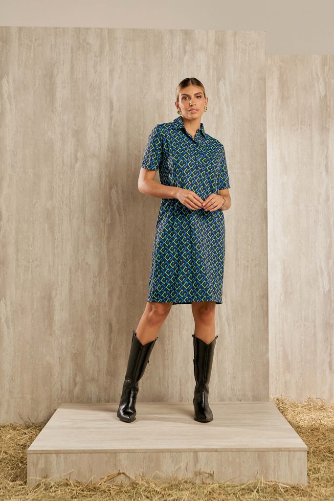 Chemise confeccionada em tecido de Fluity com estamparia exclusiva. Possui gola de camisa, vista interrompida com botões, manga curta com barra italiana, bolsos laterais e comprimento midi.