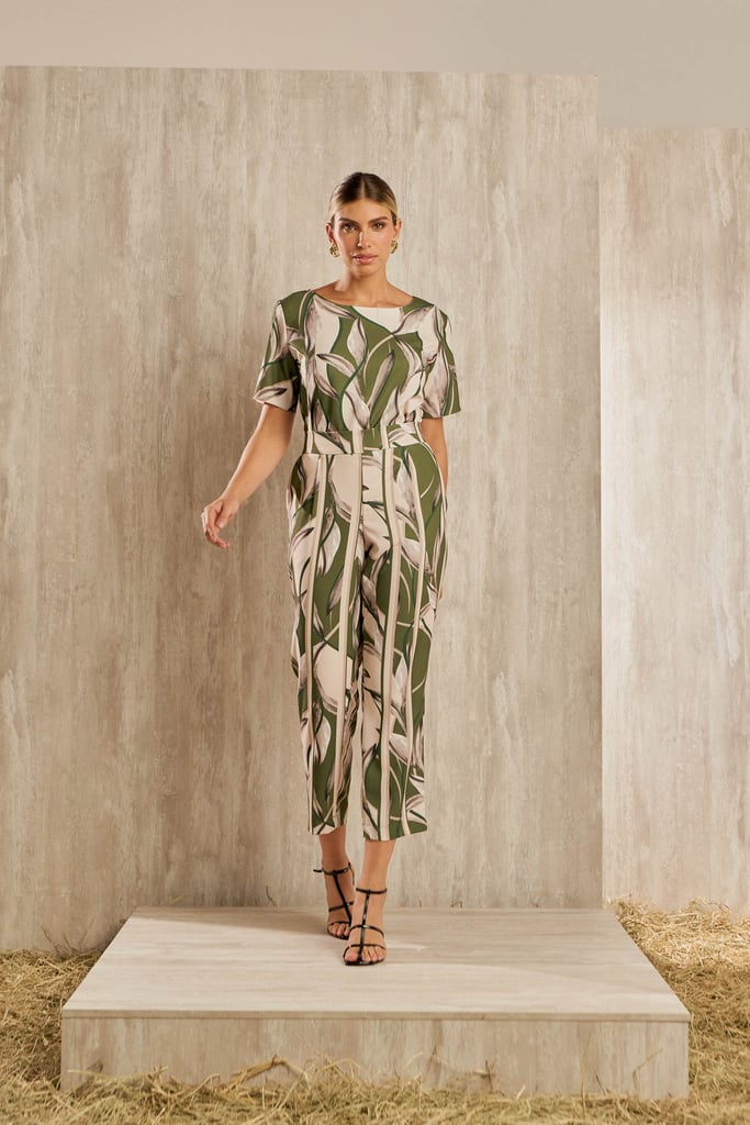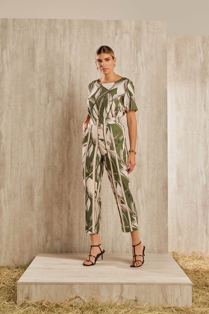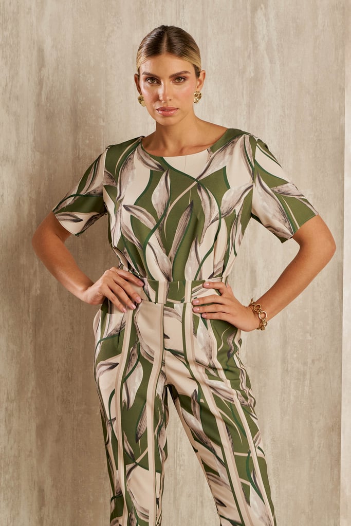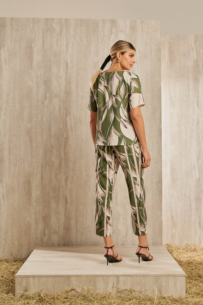 Conjunto confeccionado em crepe com estamparia exclusiva. Blusa possui decote redondo e manga curta. Calça traz nossa modelagem clássica reta com pregas frontais, bolsos laterais e cós com elástico nas costas para maior conforto.