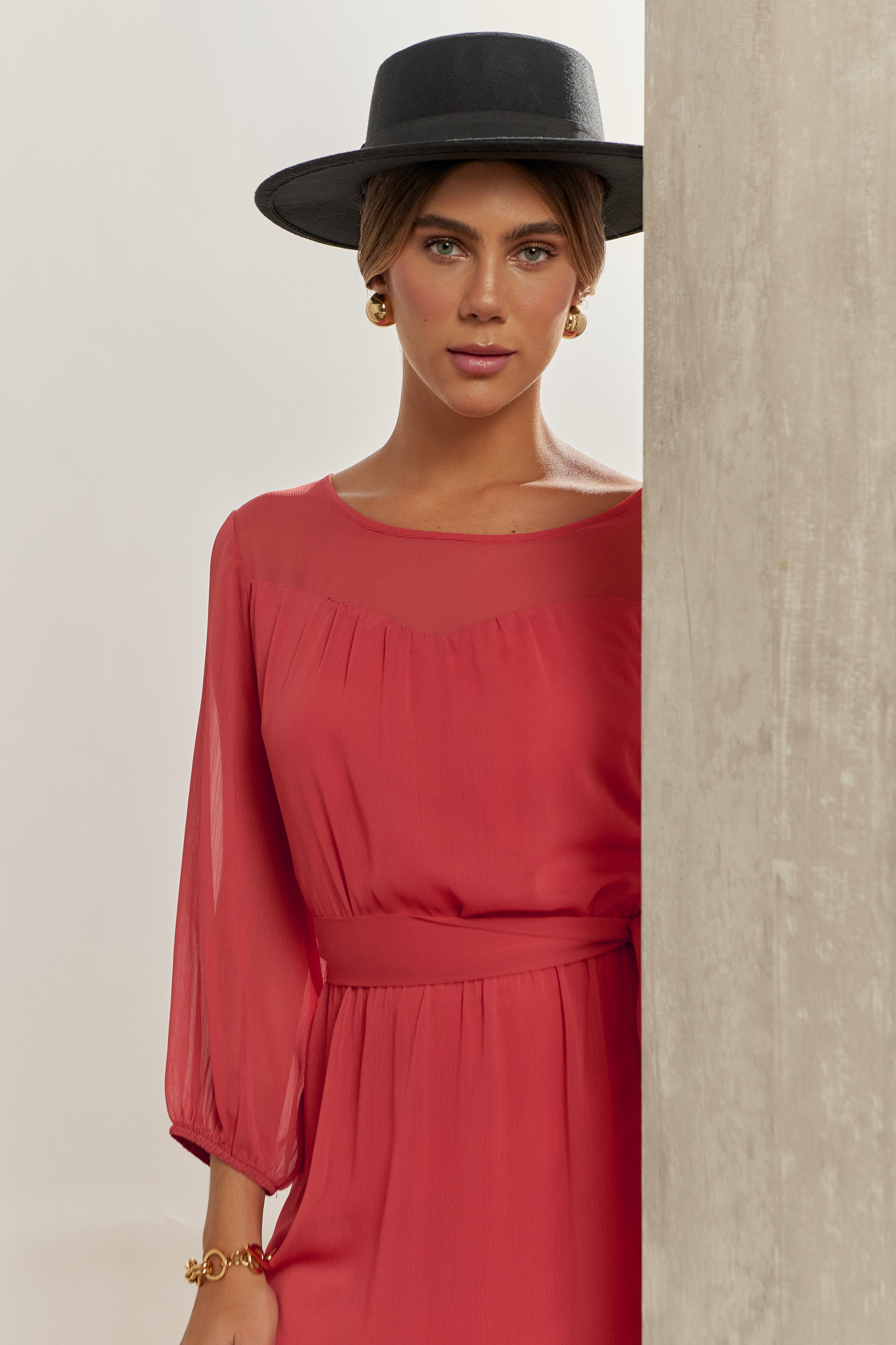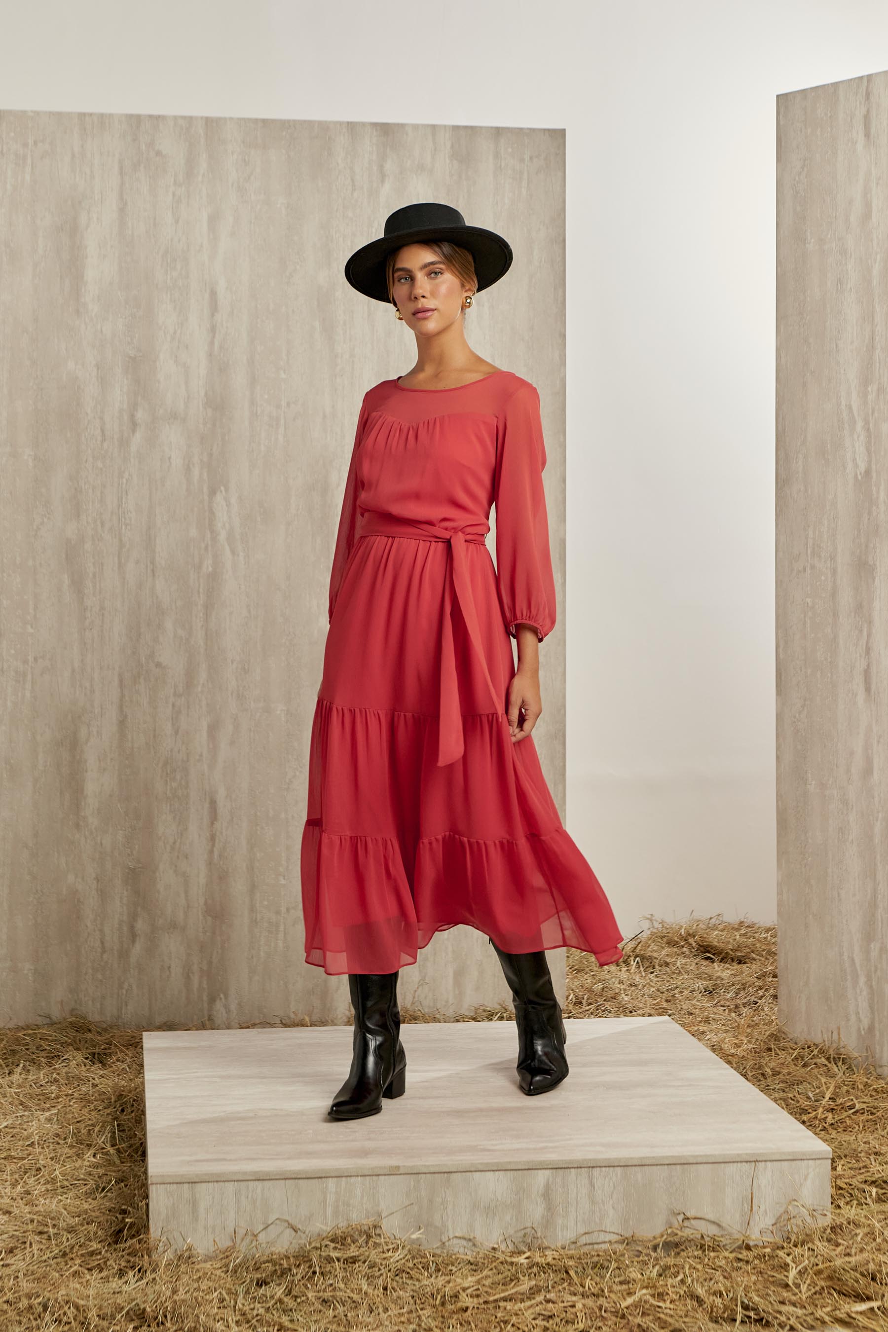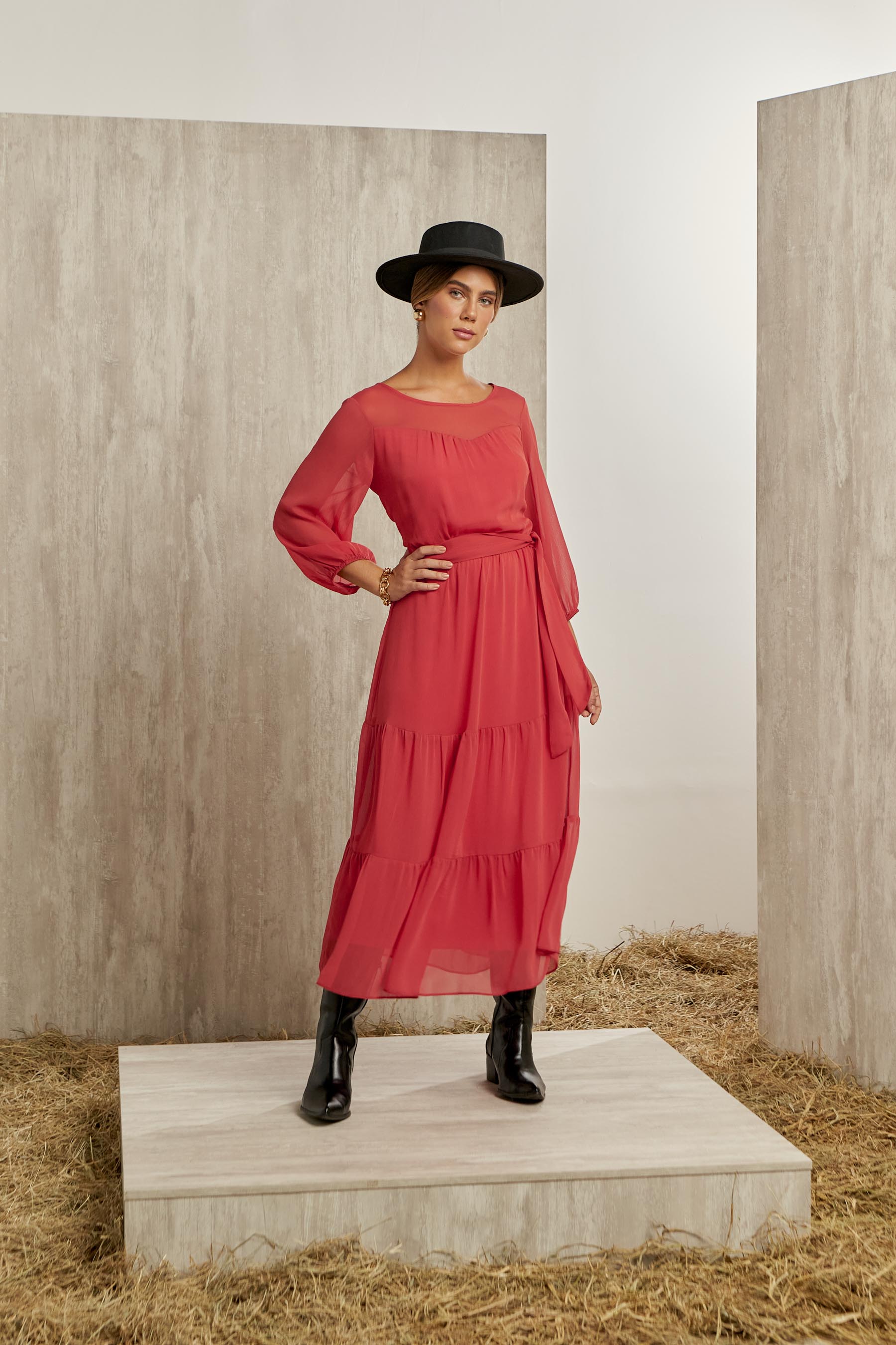 Vestido confeccionado em chiffon texturizado. Possui dois formatos de decotes que se sobrepõe e manga 3/4 com terminação de elástico. Faixa do mesmo tecido costurada na lateral para amarração. Detalhe de babados na saia que dão todo charme à peça. Comprimento midi. Contém forro.