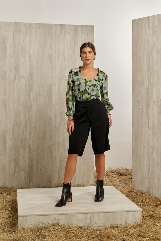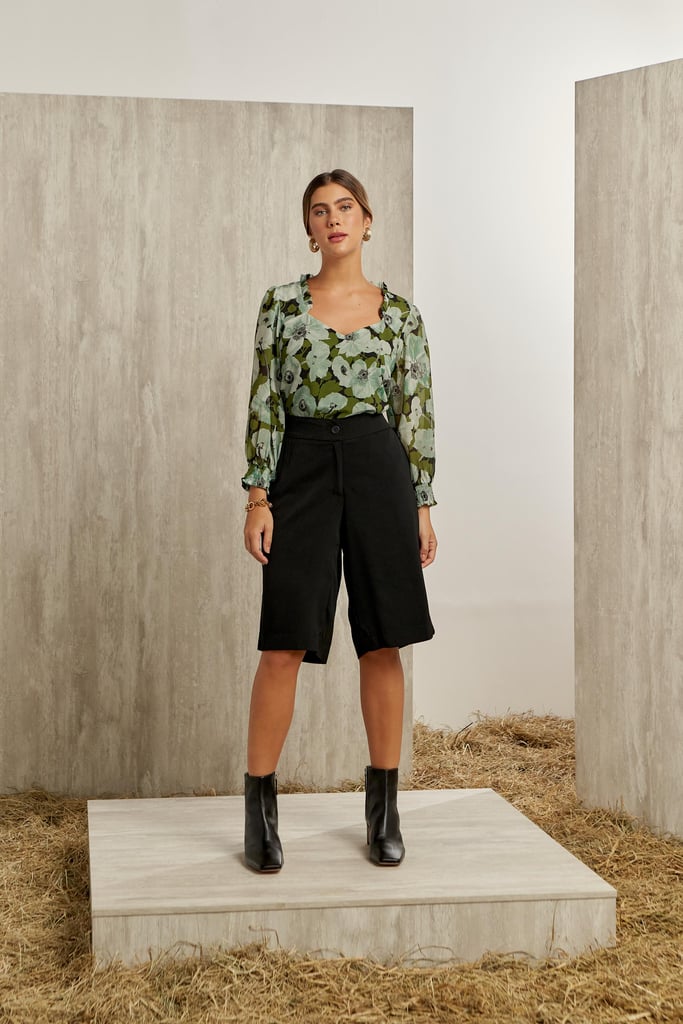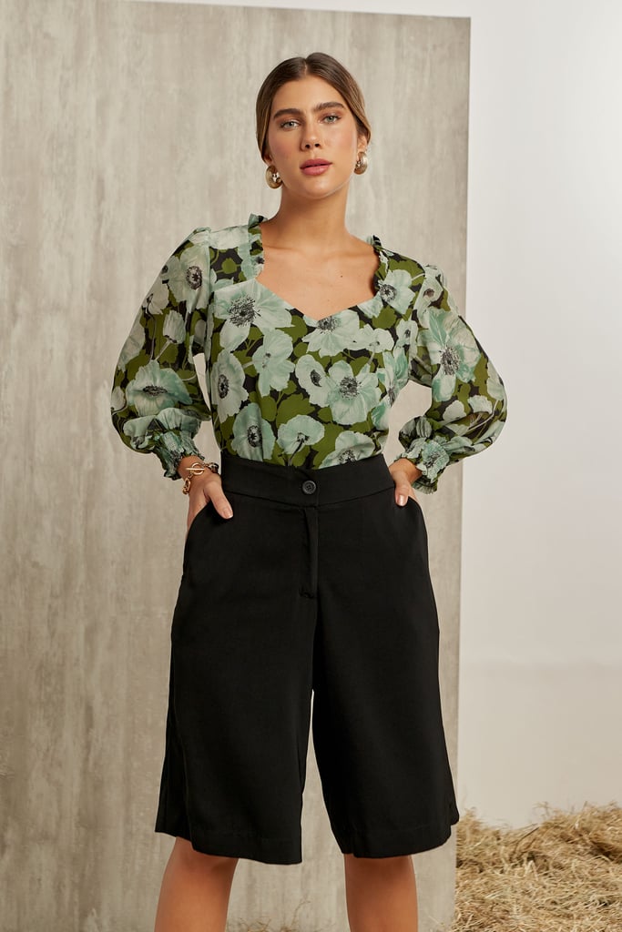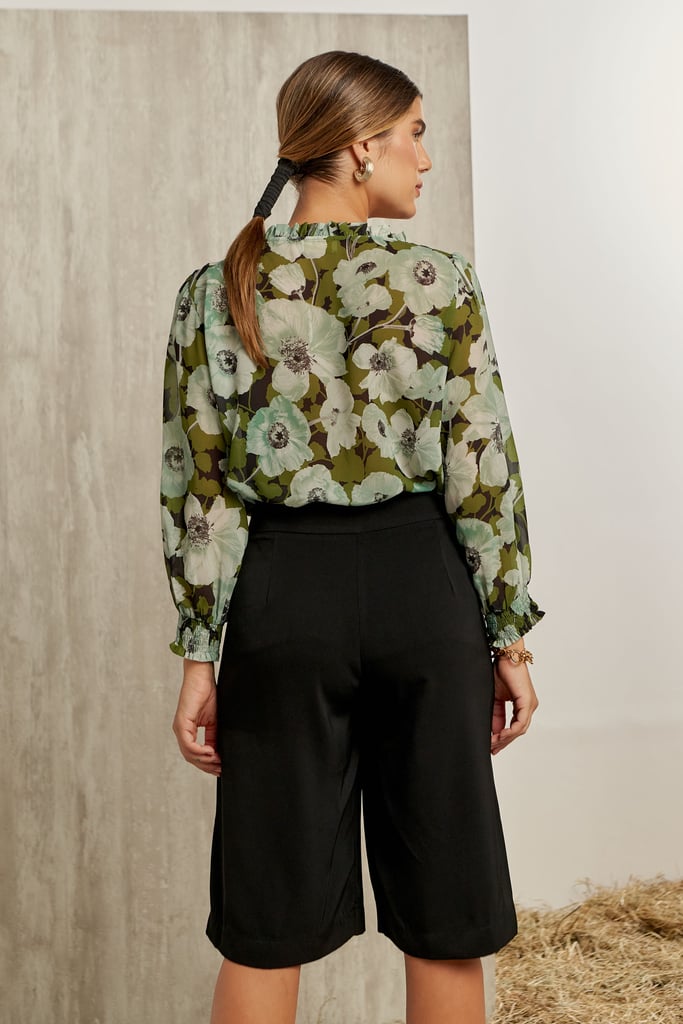 Blusa confeccionada em chiffon com padronagem floral exclusiva. Possui decote princesa com detalhe de mini babados e manga 3/4 com terminação de lastex. Possui forro.