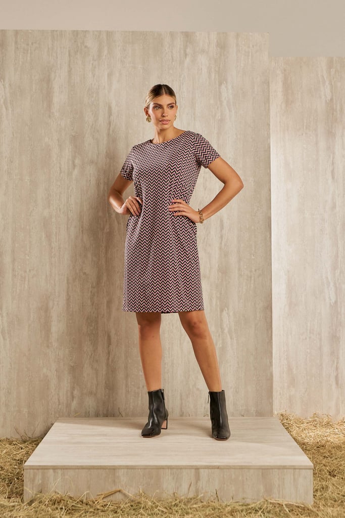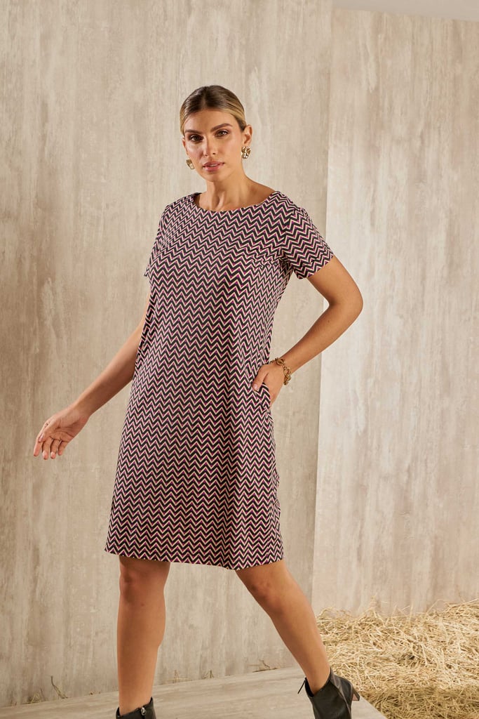 Vestido estilo tubo confeccionado em Fluity. Possui decote redondo, manga curta com barra italiana e bolsos laterais.