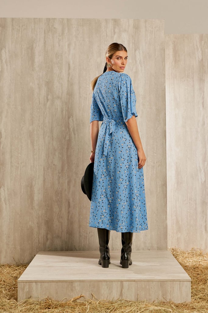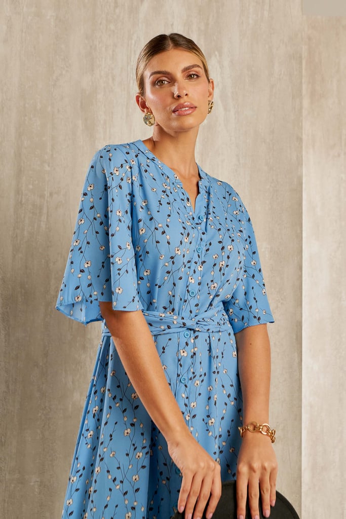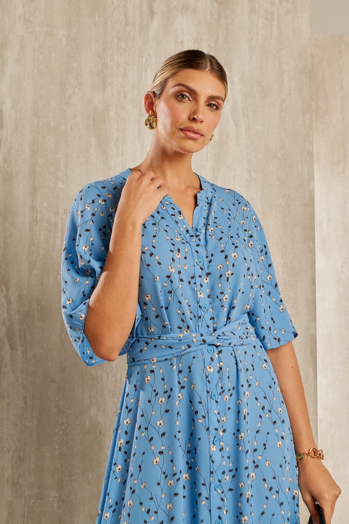 Vestido camisa confeccionado em tecido de crepe estampado. Possui gola de padre, vista frontal com botões e manga 3/4 tipo sino. Acompanha faixa do mesmo tecido para amarração.