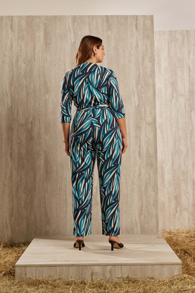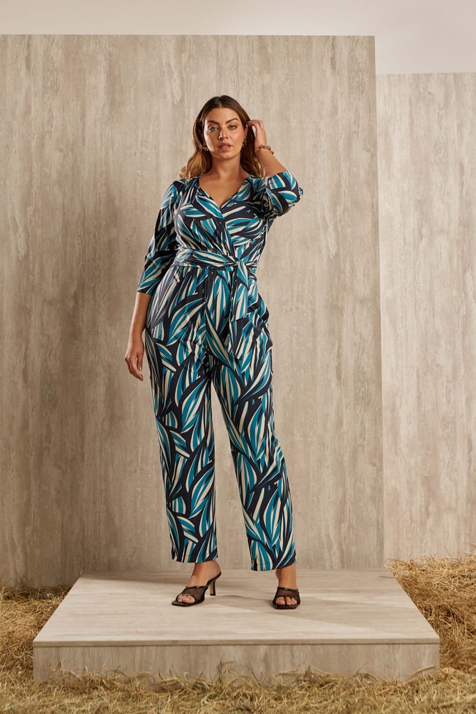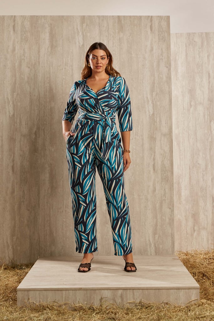 Macacão confeccionado em tecido de Fluity com estampa exclusiva. Possui decote transpassado, manga 3/4, elástico na cintura com tiras para amarração e bolsos laterais. Comprimento longo.
