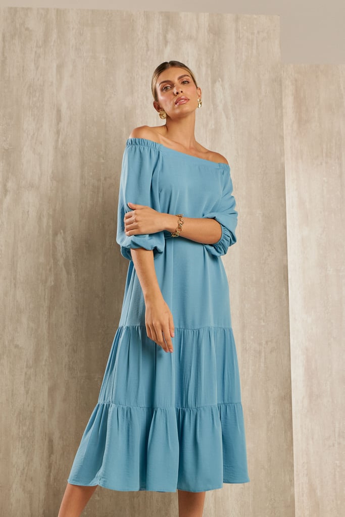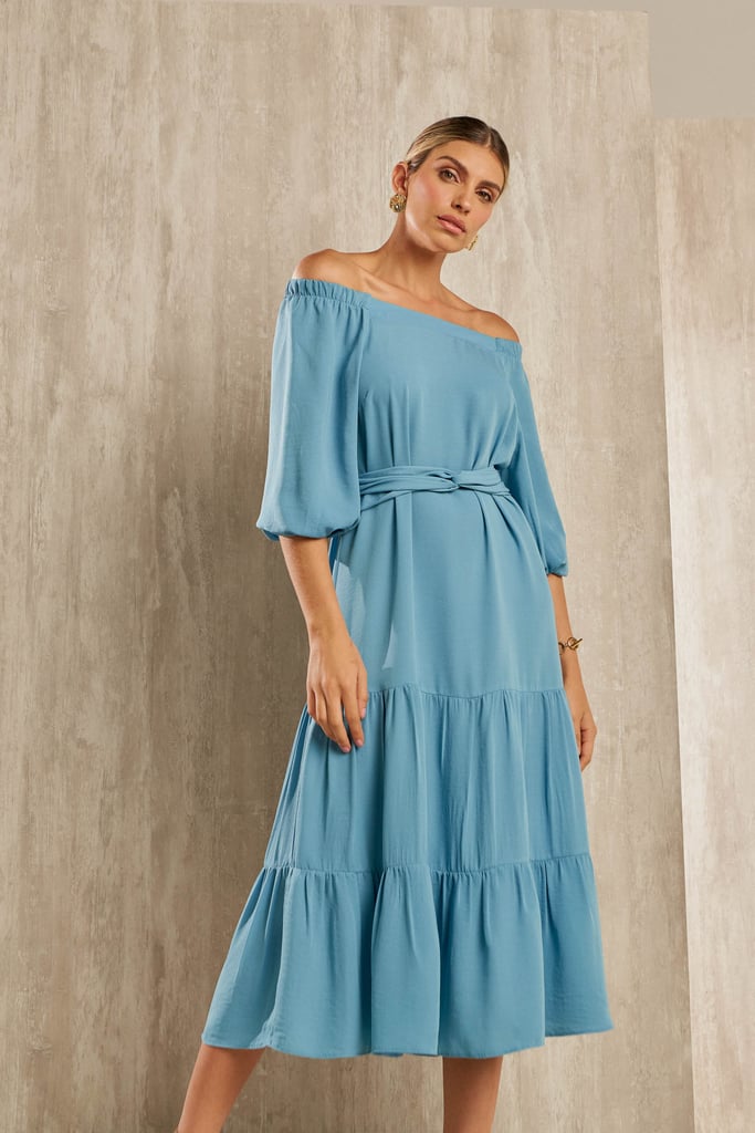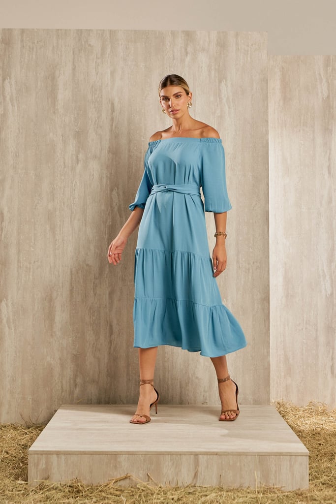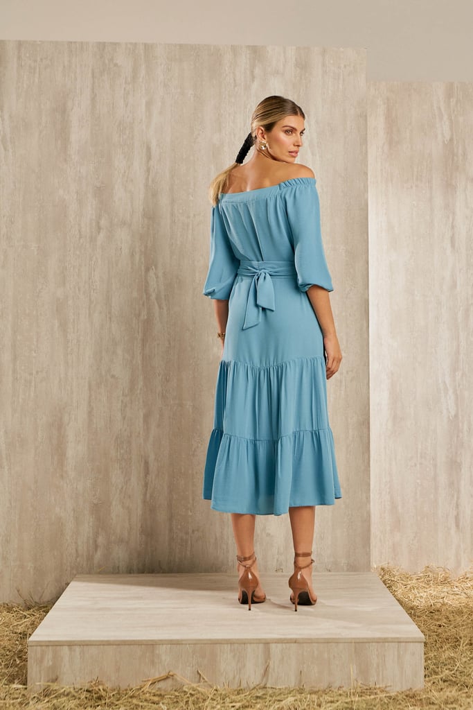 Vestido ombro a ombro confeccionado em crepe liso. Possui manga 3/4 com terminação de elástico e babados na barra. Comprimento midi. Acompanha faixa do mesmo tecido para amarração.