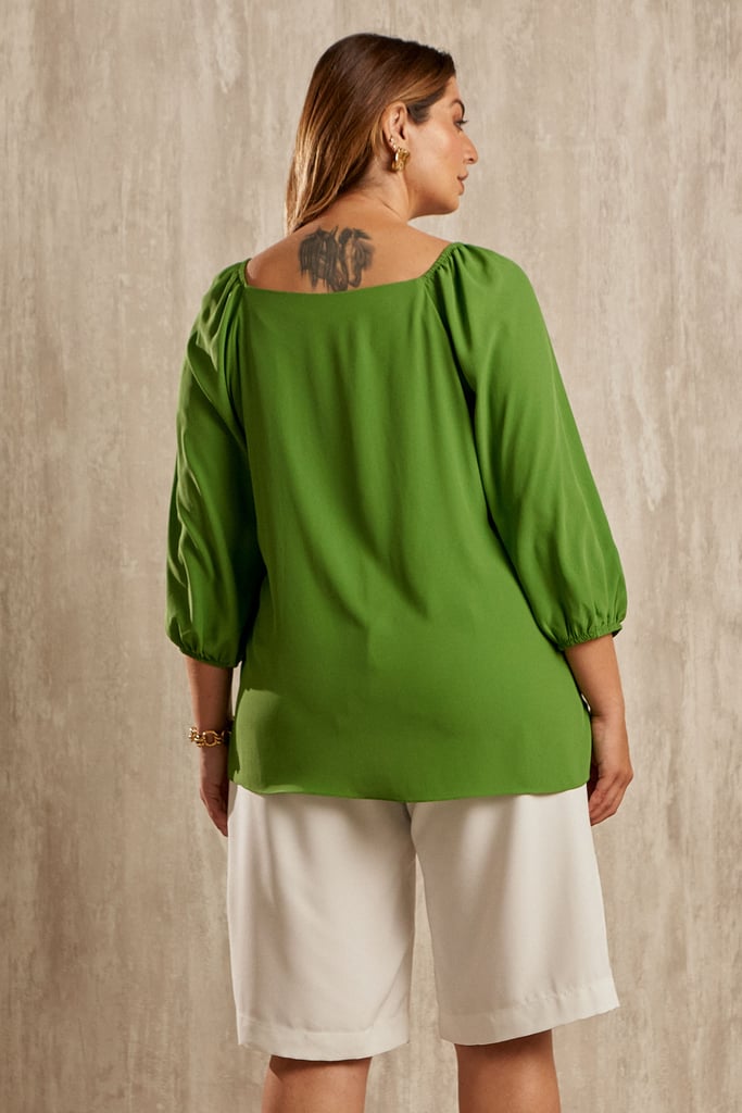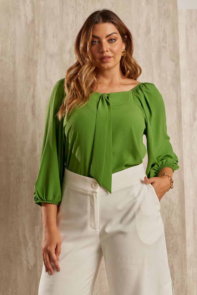 Blusa confeccionada em tecido de crepe. Possui decote com tiras para amarração e manga 3/4 com terminação de elástico.