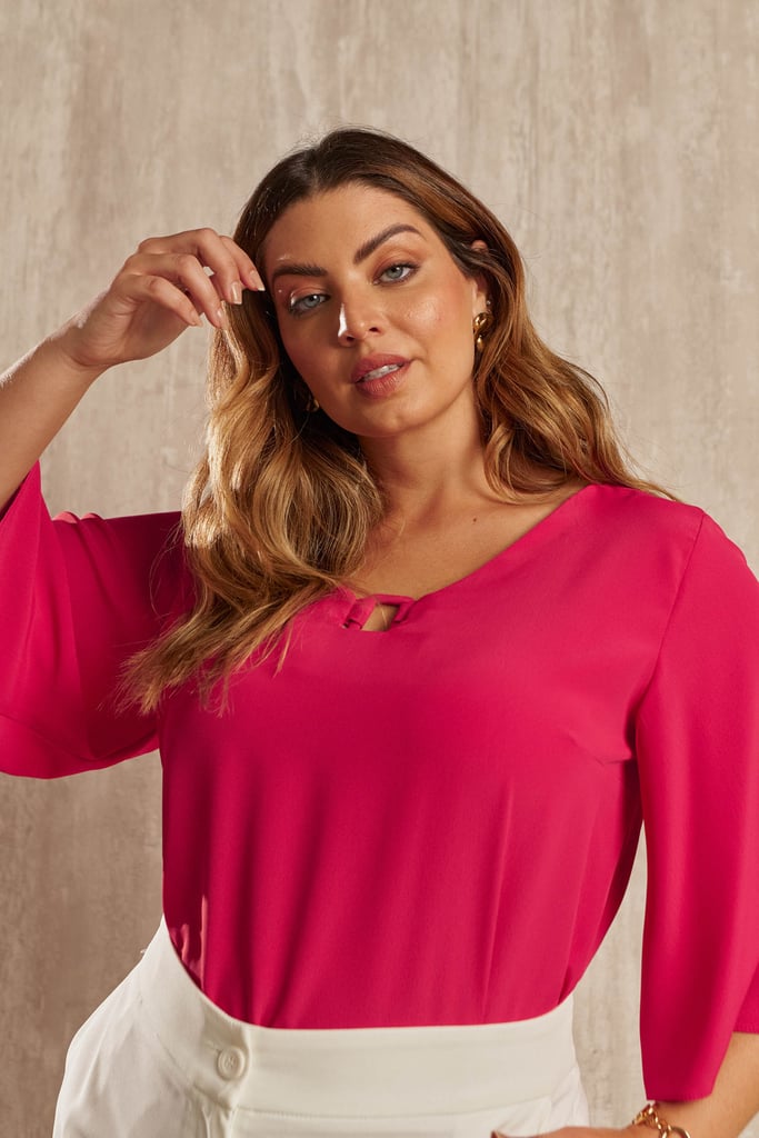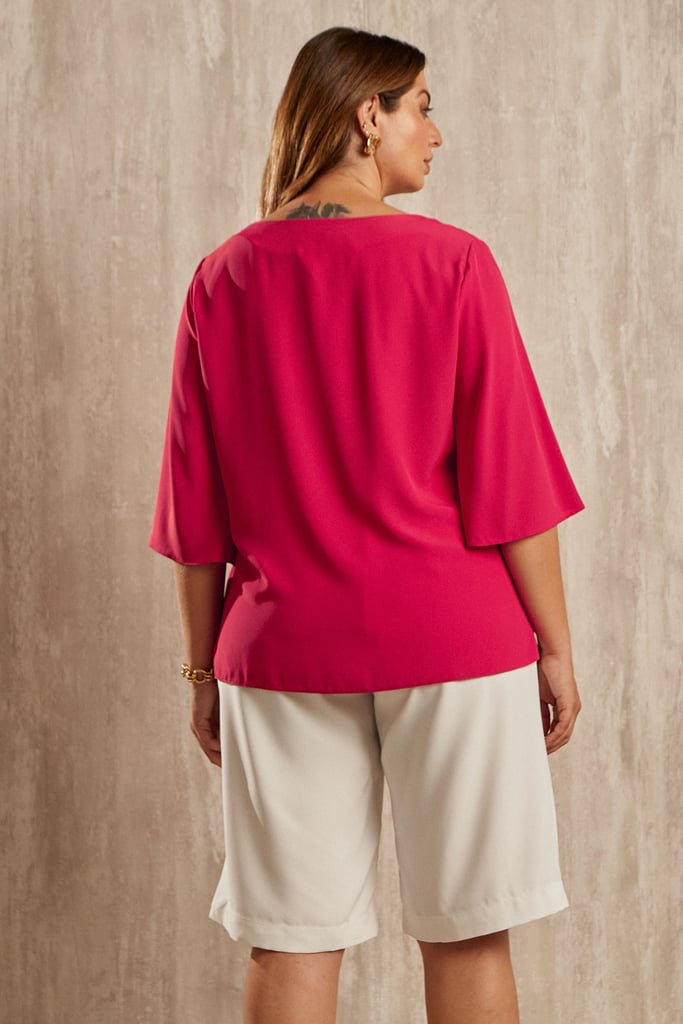 Blusa confeccionada em tecido de crepe. Possui aviamento forrado com o mesmo tecido no decote V e manga 3/4 tipo sino.
