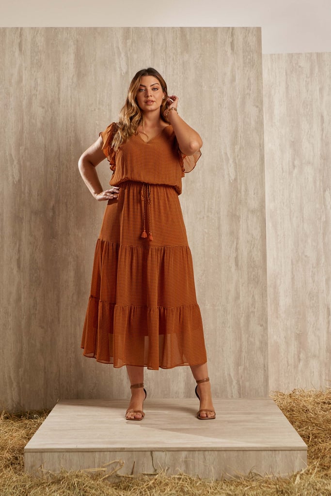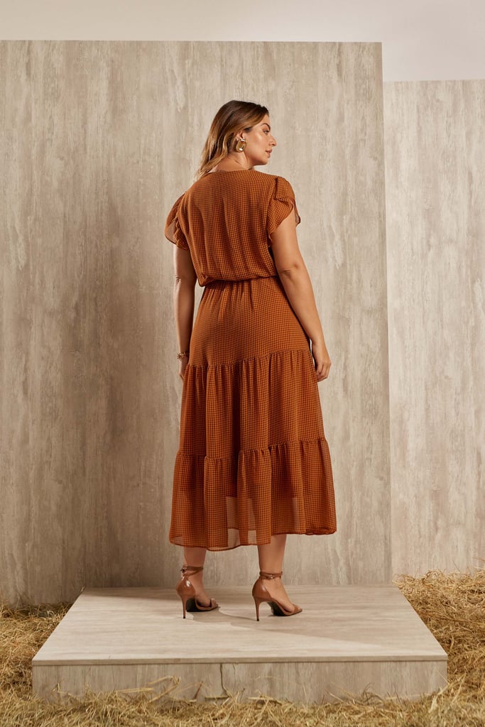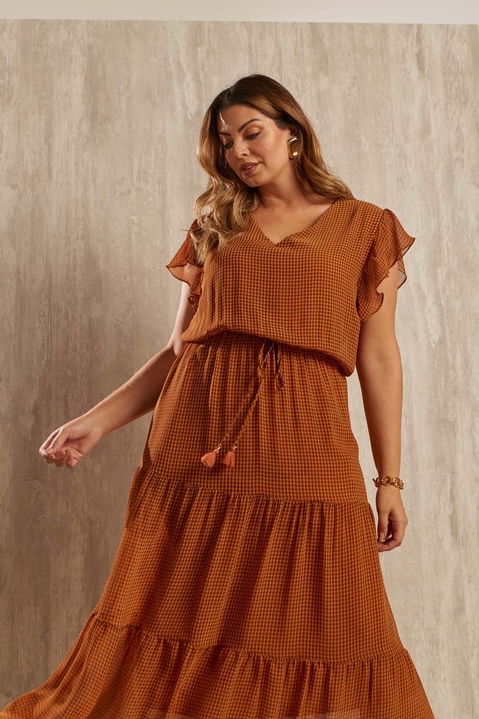 Vestido confeccionado em chiffon estampado com padronagem vichy. Possui decote V com manga de babado. Saia midi em camadas. Detalhe de elástico na cintura para efeito blusê e tiras para amarração. Peça forrada.
