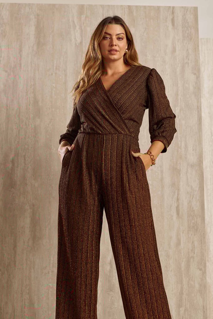 Macacão confeccionado em tecido de lurex. Possui decote transpassado, manga 3/4 com leve franzido no ombro, pregas frontais e bolsos laterais. Comprimento longo.