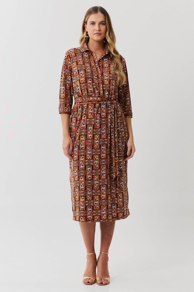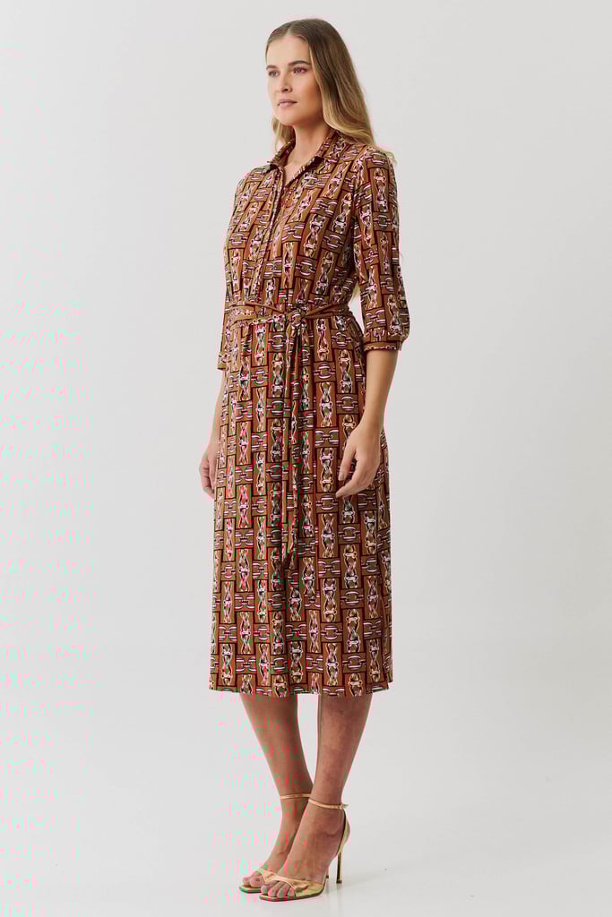 Vestido confeccionado em malha creponada com estampa exclusiva. Possui gola, vista interrompida com botões, elástico na cintura, manga ¾ com punho, bolsos e fendas laterais. Acompanha faixa do mesmo tecido para amarração.