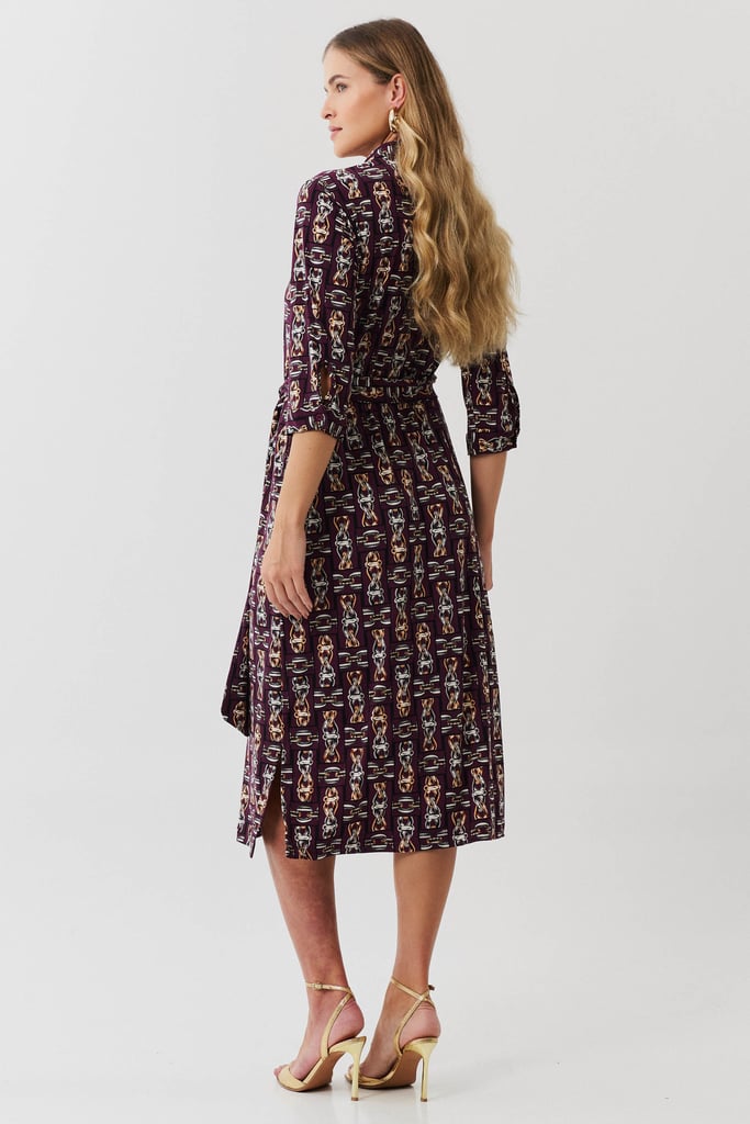 Vestido confeccionado em malha creponada com estampa exclusiva. Possui gola, vista interrompida com botões, elástico na cintura, manga ¾ com punho, bolsos e fendas laterais. Acompanha faixa do mesmo tecido para amarração.
