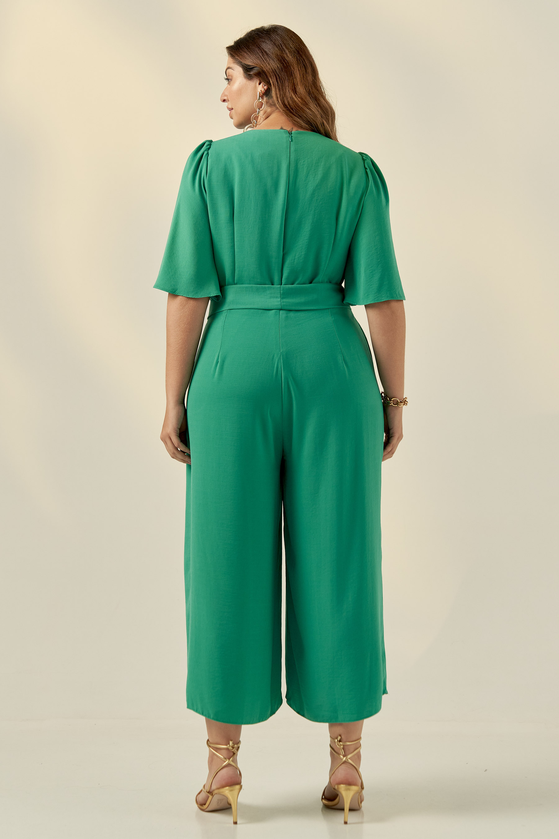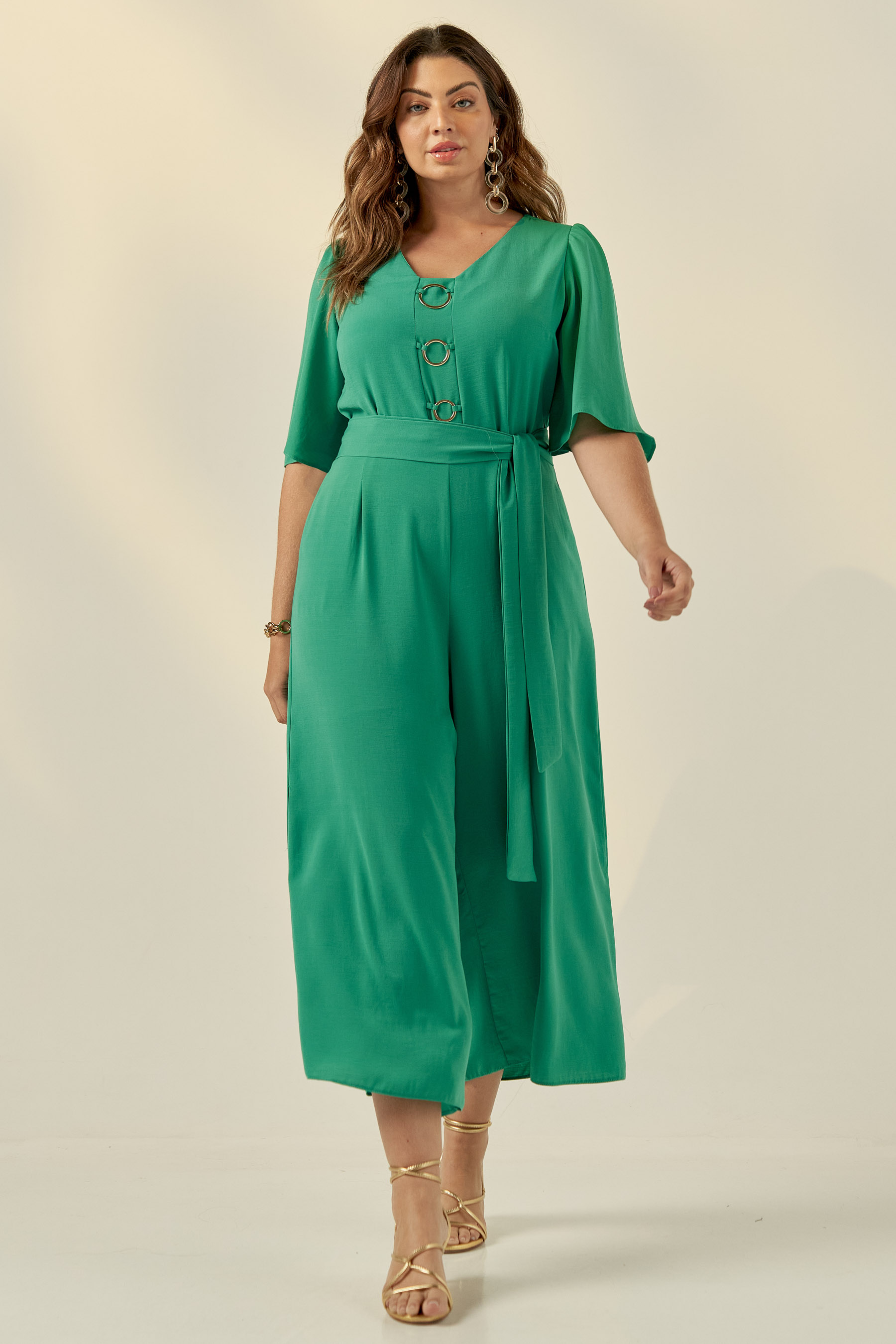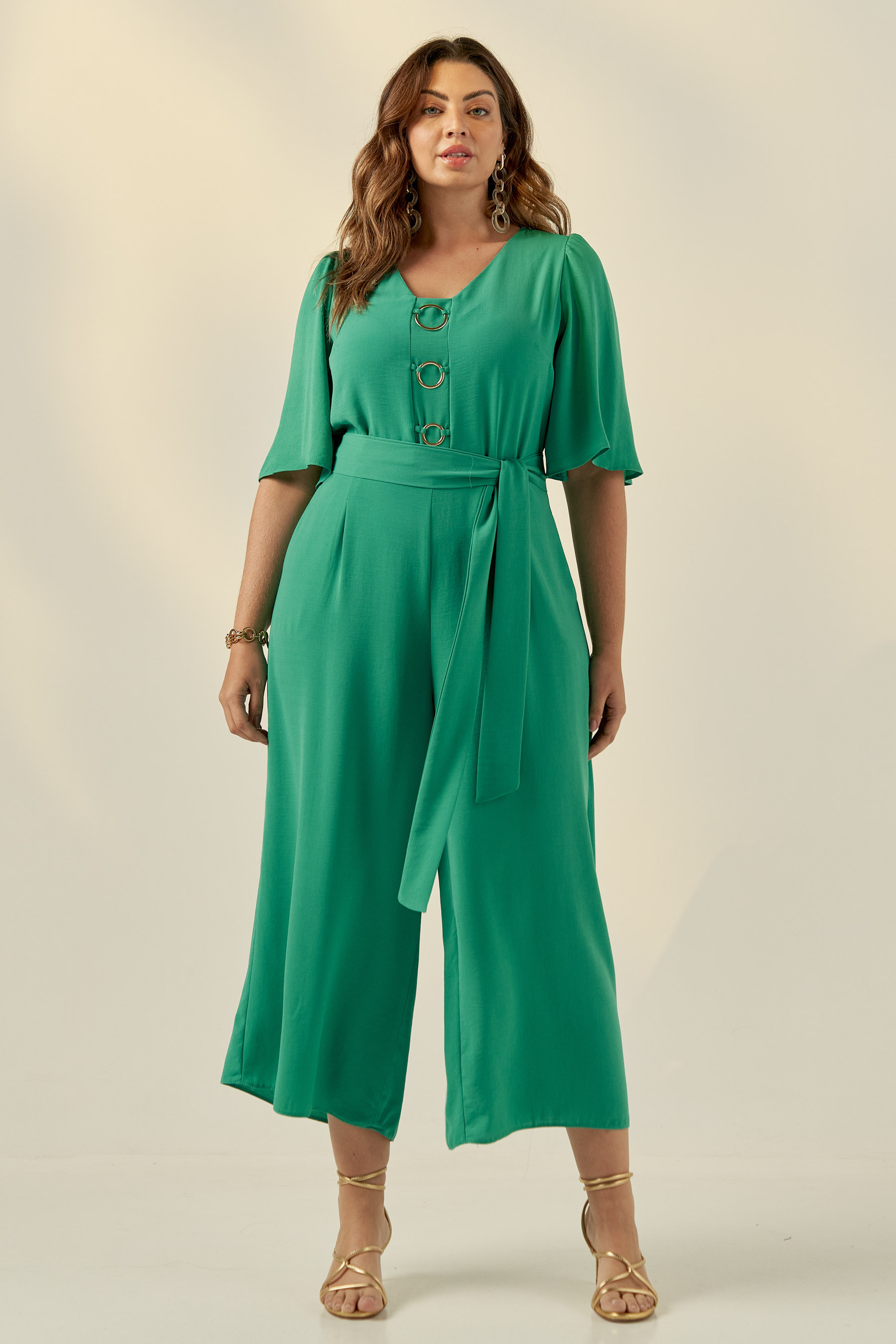 Macacão pantacourt confeccionado em tecido de crepe liso. Possui decote V, bolsos laterais e mangas 3/4 tipo sino. Detalhe frontal de argolas douradas que dão todo charme à peça. Fechamento por zíper invisível nas costas.
