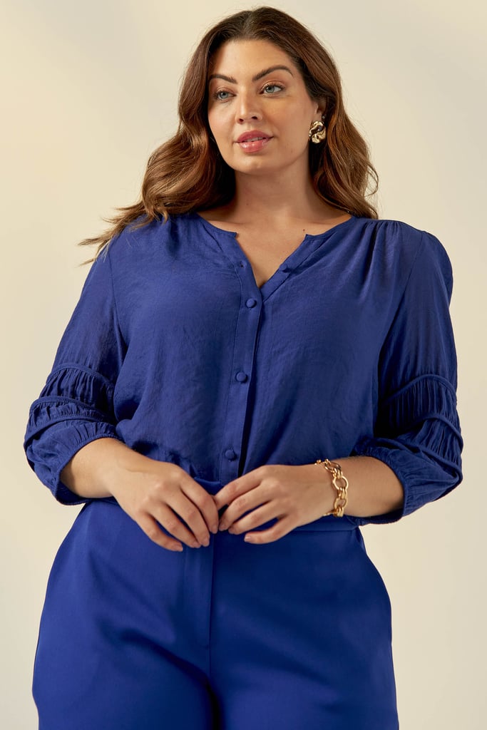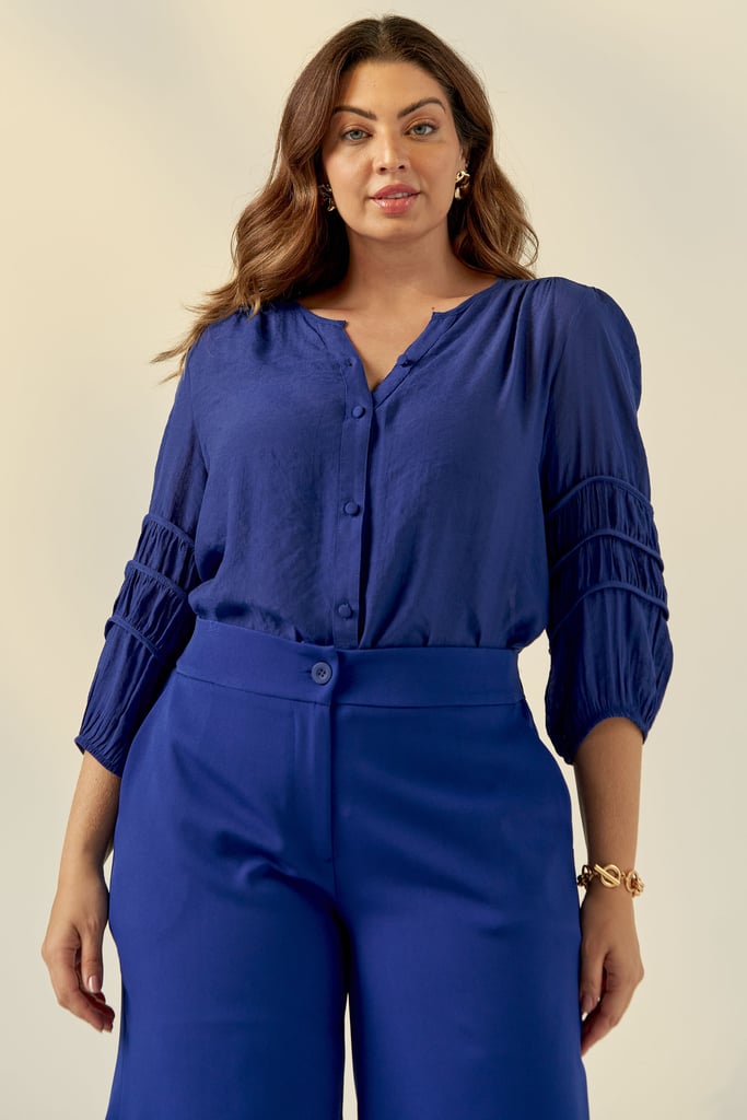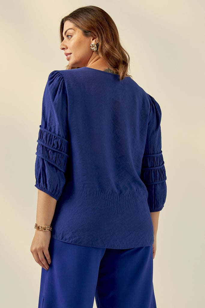 Blusa confeccionada em tecido de crepe de viscose. Possui decote redondo, vista com fechamento frontal por botões e detalhe de viés e franzido na manga que dá todo charme à peça.