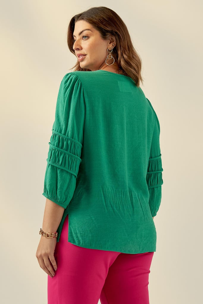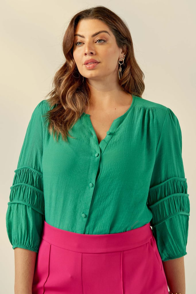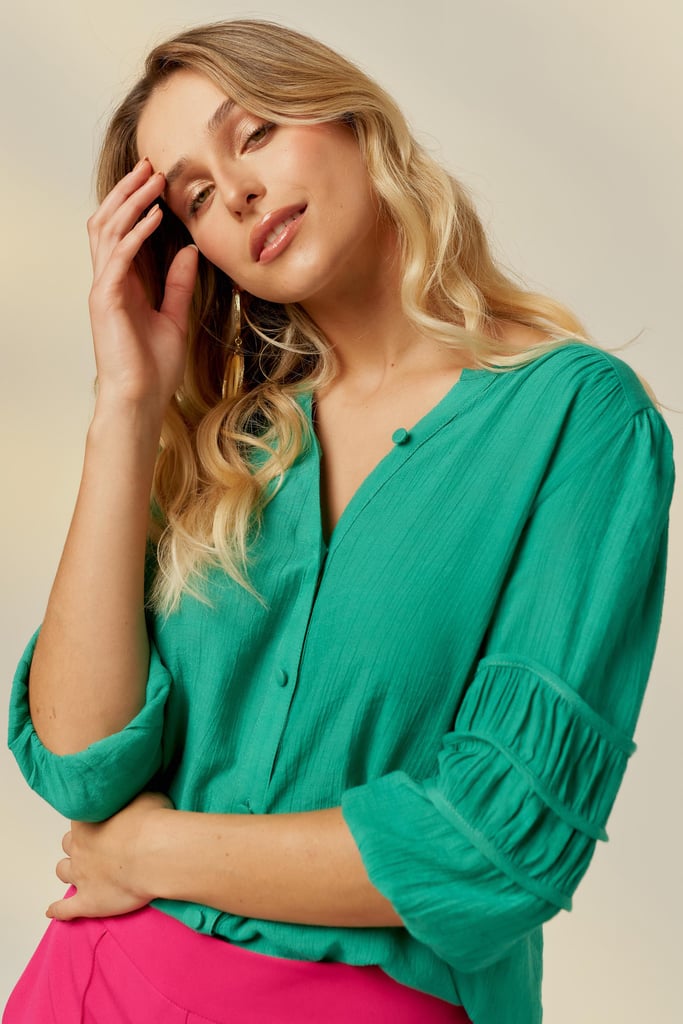 Blusa confeccionada em tecido de crepe de viscose. Possui decote redondo, vista com fechamento frontal por botões e detalhe de viés e franzido na manga que dá todo charme à peça.