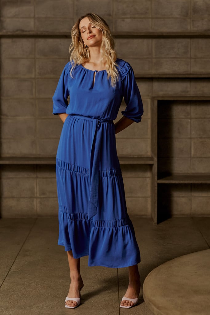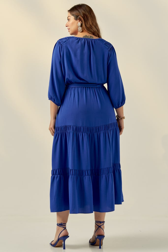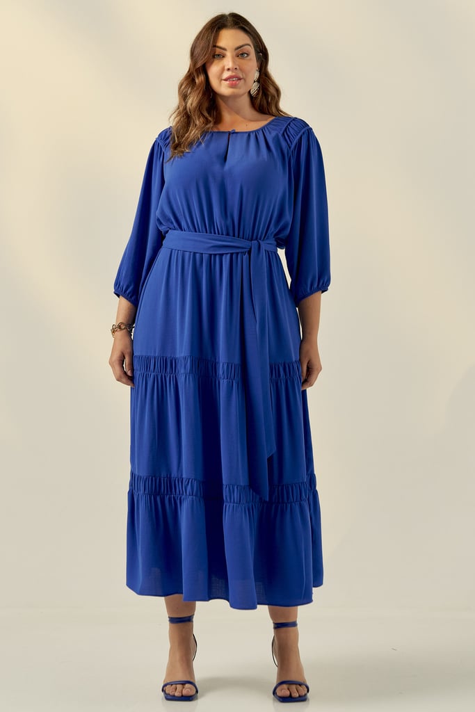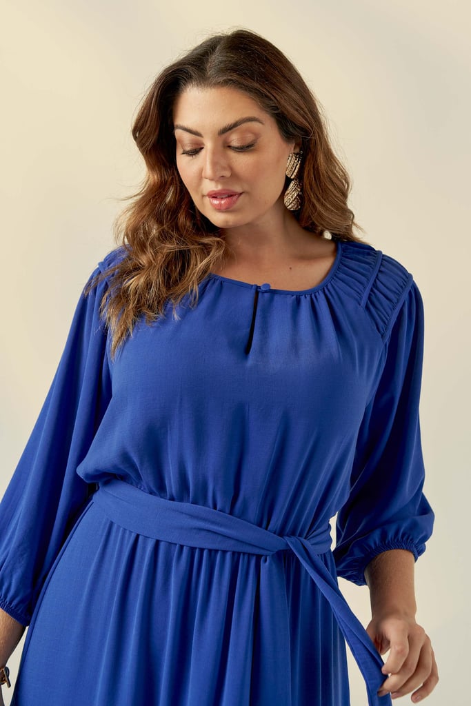 Vestido confeccionado em tecido de crepe liso. Possui decote redondo com abertura fechada por botão e manga raglan 3/4. Elástico interno na cintura para maior conforto e efeito blusê. Detalhe de franzido no ombro e saia. Comprimento midi.