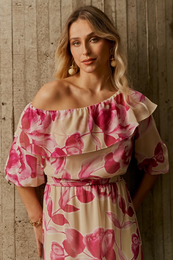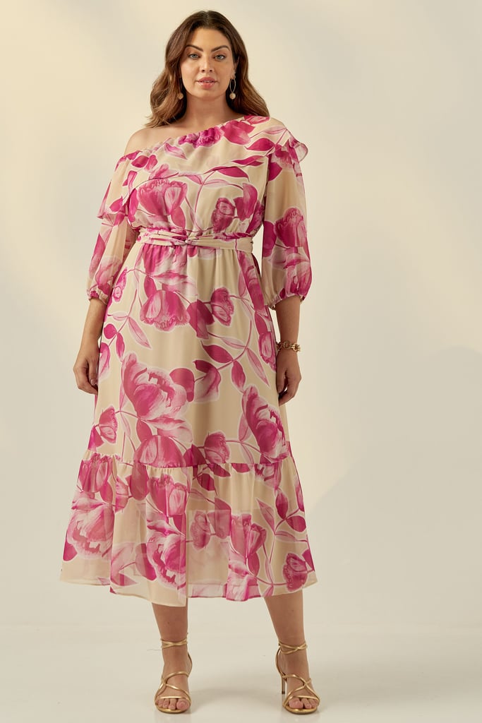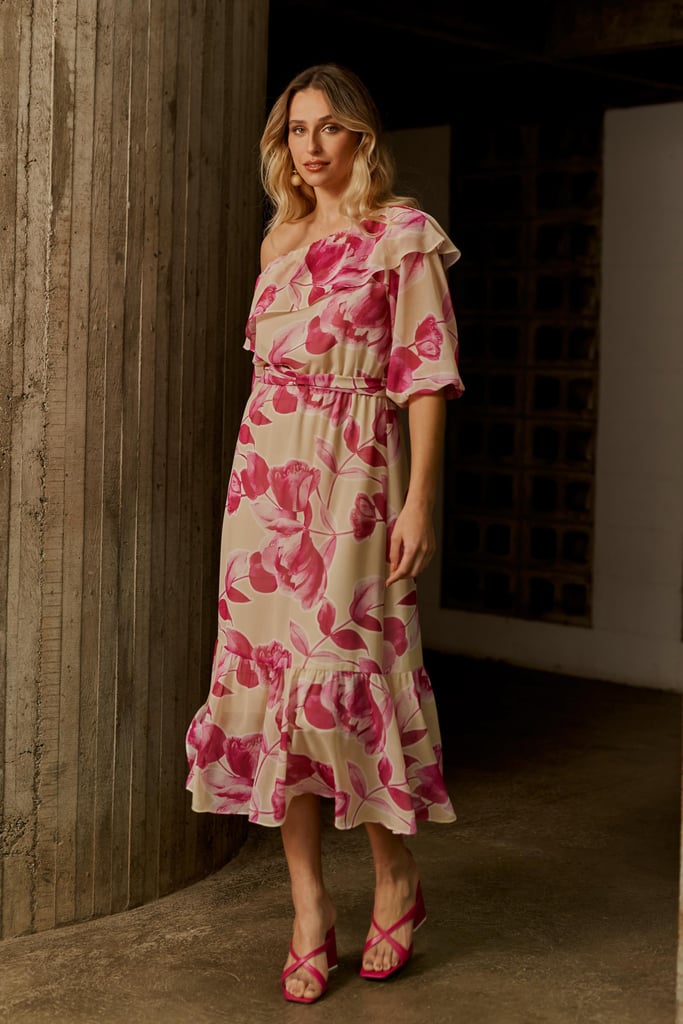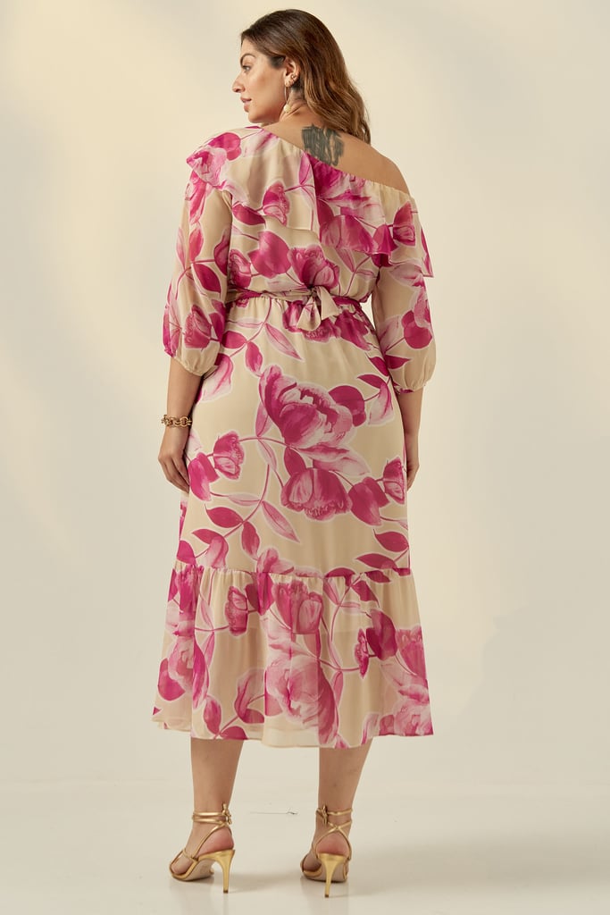 Vestido confeccionado em tecido de chiffon com padronagem floral exclusiva. Possui decote assimétrico com babado e manga 3/4 com terminação de elástico. Saia midi com babado na barra. Acompanha faixa do mesmo tecido para amarração. Peça forrada.